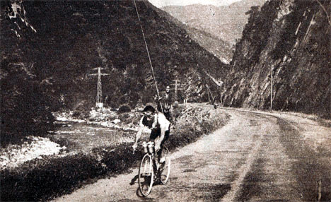 - Dans la descente, c'est une hécatombe de boyaux sur une "route" en piteux état. Robic y crève deux fois à l'inverse des Italiens qui ont, semble-t-il, de biens meilleurs boyaux. Tacca se retrouve isolé en tête bien malgré lui. Derrière trois Italiens mènent la chasse : Bertocchi, Bresci & Volpi. De Gribaldy chute et abandonne. La situation à Barrèges (km 109) est la suivante : Tacca en tête, à 1' Volpi, Bresci & le maillot jaune Bertocchi, à 6'00" Galliussi & Robic, à 6'40" A. Lazaridès, Martini, Fachleitner, à 6'55" Cogan, à 7'40" De Muer, à 7'55" Giauna, à 8'05" Dupont, à 9'55" Van Verre, à 10'20" Cosson, à 11'00" Brambilla & Pontet etc.