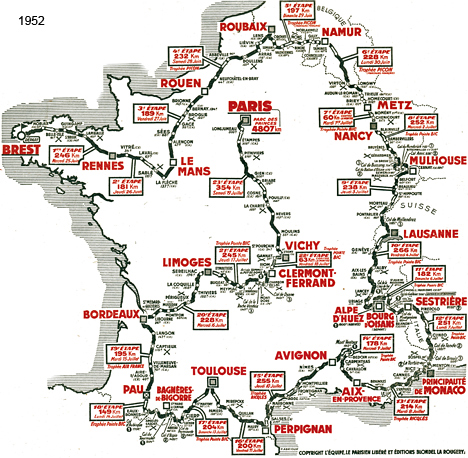 l'absence de ses principaux rivaux : Koblet, Kübler, Bobet, forfaits pour des raisons de santé. Ses concurrents sont Géminiani, Bartali, Ockers et Robic.Après un début dominé par les Belges, Coppi est le vainqueur de la première ascension de l'Alpe d'Huez et confirme sa supériorité chez lui à Sestrières malgré une belle résistance de Robic. Au classement général, il laisse un surprenant Stan Ockers à près de 30 minutes. Le parcours - Les partants - Les étapes - Les classements Histoire des maillots ![]() maillots : Jean-Louis Bey Étapes du 25 juin au 19 juillet 1952 1 Brest - Rennes, 246 km 2 Rennes - Le Mans, 181 km 3 Le Mans - Rouen, 189 km 4 Rouen - Roubaix, 232 km 5 Roubaix - Namur (Bel), 197 km 6 Namur - Metz, 228 km 7 Metz - Nancy, 60 km CLM 8 Nancy - Mulhouse, 252 km 9 Mulhouse - Lausanne, 238 km 10 Lausanne - L'Alpe d'Huez, 266 km 11 Le Bourg d'Oisans - Sestrières (Ita), 182 km 12 Sestrières (Ita) - Monaco, 251 km 13 Monaco - Aix-en-Provence, 214 km 14 Aix-en-Provence - Avignon, 178 km 15 Avignon - Perpignan, 275 km 16 Perpignan - Toulouse, 200 km 17 Toulouse - Bagnères de Bigorre, 204 km 18 Bagnères de Bigorre - Pau, 149 km 19 Pau - Bordeaux, 195 km 20 Bordeaux - Limoges, 228 km 21 Limoges - Clermont-Ferrand/Puy de Dôme, 245 km 22 Clermont-Ferrand - Vichy, 63 km CLM 23 Vichy - Paris, 354 km La petite histoire : Les nouveautés : - La télévision fait son apparition sur le Tour, pour la première fois des images sont diffusées le soir même au journal télévisé. - Création de la prime de la combativité. - Création d'un classement par équipes à chaque étape. - Nouvelles villes étapes : Le Mans, Namur, Bagnères de Bigorre, Pau, L'Alpe-d'Huez, Le Bourg-d'Oisans, Sestrières (Ita) et Vichy. - Nouvelles ascensions : L'Alpe-d'Huez, Amic, Brouis, Hundsrück, Portel, Le Puy-de-Dôme, Sestrières (Ita), Tende. Jours de repos : samedi 5 juillet à l'Alpe d'Huez, samedi 12 juillet à Toulouse. - Bonifications étape : 1' au premier, 30" au second. - Bonifications montagne : 40" au 1er et 20" au 2ème au sommet des cols de 1ère catégorie, 20" au 1er pour les cols de 2ème catégorie. - G.P de la montagne : 1ère cat. : 10, 9, 8 ..., 1 pt - 2ème cat. : 6, 5, 4, 3, 2, 1 pt - 3ème cat. : 3, 2, 1 pt - Challenge international par équipes : à chaque étape sont comptabilisés les temps des 3 premiers de chaque équipe. Sponsors : - Général : Laines SOFIL - Étapes : sponsors différents à chaque étape - LA SUZE, BIC, RICQLÈS, AIR FRANCE etc. - Challenge international (équipes) : challenge MARTINI - Grand Prix de la montagne : SAINT-RAPHAËL QUINQUINA - Combativité : LE SUCRE (prix non attribué si le nombre de voix pour désigner un lauréat n'est pas suffisant). ![]() SUISSE Directeur sportif : Alexandre BURTIN ![]() 1 SPUHLER Heinrich (Sui) 2 DIGGELMANN Walter (Sui) 3 HUBER Marcel (Sui) ab.8° 4 METZGER Martin (Sui) ab.11° 5 LAFRANCHI Carlo (Sui) 6 WEILENMANN Gottfried (Sui) 7 AESCHLIMANN Roger (Sui) ab.5° 8 REISER Walter (Sui) ab.4° BELGIQUE Directeur sportif : Sylvere MAES ![]() 9 BLOMME Maurice (Bel) ab.6° 10 CLOSE Alex (Bel) 11 DECOCK Roger (Bel) 12 DE HERTOG Alois (Bel) 13 DERIJCKE Germain (Bel) ab.3° 14 NEYT Maurice (Bel) 15 OCKERS Stan (Bel) 16 ROSSEEL André (Bel) 17 VANDERSTOCKT Robert (Bel) ab.8° 18 VAN ENDE Edward (Bel) 19 VAN KERCKHOVE Henri (Bel) ab.8° 20 VAN STEENBERGEN Hendrik (Bel) ab.6° ITALIE Directeur sportif : Alfredo BINDA ![]() 21 BARONI Mario (Ita) 22 BARTALI Gino (Ita) 23 BRESCI Giulio (Ita) 24 CARREA Andrea (Ita) 25 COPPI Fausto (Ita) 26 CORRIERI Giovanni (Ita) 27 CRIPPA Fiorenzo (Ita) 28 FRANCHI Franco (Ita) 29 MAGNI Fiorenzo (Ita) 30 MARTINI Alfredo (Ita) 31 MILANO Ettore (Ita) 32 PEZZI Luciano (Ita) FRANCE Directeur sportif : Marcel BIDOT ![]() 33 BONNAVENTURE Robert (Fra) 34 DOTTO Jean (Fra) 35 GAUTHIER Bernard (Fra) 36 GÉMINIANI Raphaël (Fra) 37 LAUREDI Nello (Ita) 38 LAZARIDÈS Lucien (Fra) 39 MULLER Édouard (Fra) hd.2° 40 QUENTIN Maurice (Fra) 41 RÉMY Raoul (Fra) 42 ROBIC Jean (Fra) 43 ROLLAND Antonin (Fra) 44 TEISSEIRE Lucien (Fra) PAYS-BAS Directeur sportif : Kees PELLENAERS ![]() 45 DEKKERS Hans (Hol) 46 FAANHOF Henk (Hol) 47 NOLTEN Jan (Hol) 48 ROKS Thijs (Hol) 49 VAN BREENEN Hein (Hol) 50 VAN EST Wim (Hol) 51 VOORTING Gerrit (Hol) 52 WAGTMANS Wout (Hol) ESPAGNE Directeur sportif : Mario CANARDO ![]() 53 GELABERT Antonio (Esp) 54 GIL Jose (Esp) 55 MASIP Francisco (Esp) 56 PEREZ-LLACER José (Esp) hd.18° 57 RUIZ Bernardo (Esp) 58 SERRA José (Esp) 59 TROBAT Andres (Esp) 60 VIDAURRETA Hortensio (Esp) ab.2° LUXEMBOURG / AUSTRALIE Directeur sportif : Nicolas FRANTZ ![]() 61 BINTZ Robert (Lux) np.14° 62 63 DIEDERICH Jean "Bim" (Lux) hd.11° 64 GOEDERT Johnny (Lux) 65 GOLDSCHMIT Jean (Lux) 66 KEMP Willy (Lux) hd.11° 67 BEASLAY John (Aus) hd.2° 68 PARIS Directeur sportif : Fernand MITHOUARD ![]() 69 CAPUT Louis (Fra) ab.4° 70 CARLE Jean (Fra) hd.2° 71 CHAPATTE Robert (Fra) ab.3° 72 COSTE Charles (Fra) ab.5° 73 DECAUX Georges (Fra) 74 DUPONT Jacques (Fra) ab.6° 75 GAUDOT Pierre (Fra) ab.4° 76 MARINELLI Jacques (Fra) 77 PAPAZIAN Armand (Fra) ab.9° 78 RENAUD Jacky (Fra) 79 SCIARDIS Gino (Fra) ab.8° 80 TELOTTE Eugène (Fra) NORD-EST - CENTRE Directeur sportif : Sauveur DUCAZEAUX ![]() 81 BAUVIN Gilbert (Fra) 82 BUCHONNET Roger (Fra) ab.5° 83 CIELESKA Jean-Marie (Fra) ab.8° 84 DE GRIBALDY Jean (Fra) 85 DELEDDA Adolphe (Fra) 86 DUCARD Robert (Fra) ab.3° 87 DUSSAULT Marcel (Fra) ab.8° 88 LAJOIE Noël (Fra) ab.11° 89 MEUNIER Georges (Fra) ab.8° 90 PARDOEN Pierre (Fra) 91 ROSSINELLI Roger (Fra) 92 SOWA Alexandre (Fra) ab.5° SUD-EST Directeur sportif : Marius GUIRAMAND ![]() 93 BERTAINA Jean (Fra) 94 BIANCHI Siro (Fra) 95 CANAVESE Dominique (Fra) ab.8° 96 CHAUMARAT Albert (Fra) ab.4° 97 FACHLEITNER Édouard (Fra) ab.5° 98 GIGUET Paul (Fra) 99 LLORCA Michel (Fra) ab.10° 100 MIRANDO Joseph (Fra) 101 MOLINERIS Pierre (Fra) ab.18° 102 PEZZULI Adolphe (Fra) 103 ROTTA René (Fra) 104 VITETTA Vince