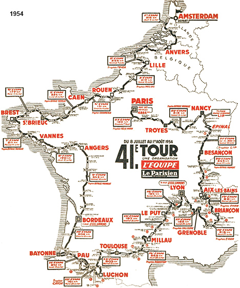 coureurs pour ce Tour suite aux problèmes sur le Giro avec les Italiens.Wout Wagtmans, Gilbert Bauvin et Louison Bobet se disputent le maillot jaune avant la montagne mais le vainqueur de 1953 fait encore la différence dans l'Izoard et distance Kübler alors que Robic et surtout Koblet sont éliminés sur chute. Bobet remporte son deuxième Tour de France. L'équipe de Suisse remporte le challenge Martini. Brankart, Bergaud et Bahamontes (classement de la montagne) sont les révélations de cette édition. Le parcours - Les partants - Les étapes - Les classements Histoire des maillots ![]() maillots : Jean-Louis Bey. Etapes du 8 juillet au 1er août 1954 1 Amsterdam-Brasschaat, 216 km 2 Anvers-Lille, 255 km 3 Lille-Rouen, 219 km 4-1 Rouen-Circuit des Essarts, 10.4 km CLM par équipes 4-2 Rouen-Caen, 131 km 5 Caen-St Brieuc, 224 km 6 St Brieuc-Brest, 179 km 7 Brest-Vannes, 211 km 8 Vannes-Angers, 190 km 9 Angers-Bordeaux, 343 km 10 Bordeaux-Bayonne, 202 km 11 Bayonne-Pau, 241 km 12 Pau-Luchon, 161 km 13 Luchon-Toulouse, 203 km 14 Toulouse-Millau, 225 km 15 Millau-Le Puy, 197 km 16 Le Puy-Lyon, 194 km 17 Lyon-Grenoble, 182 km 18 Grenoble-Briançon, 216 km 19 Briançon - Aix-les-Bains, 221 km 20 Aix-les-Bains - Besançon, 243 km 21-1 Besançon-Épinal, 134 km 21-2 Épinal-Nancy, 72 km CLM 22 Nancy-Troyes, 216 km 23 Troyes-Paris, 180 km La petite histoire : - La fédération italienne n'a pas délégué d'équipe en raison de la grande passivité qui a régné sur le Giro où une étape a été complètement neutralisée par les coureurs. De plus les Italiens ont adopté la publicité extra-sportive. - Peugeot devient partenaire officiel du Tour, les Jeep sont remplacées par des 203 décapotables. Les nouveautés : Pour la 1ère fois, le départ du Tour de France est donné de l'étranger. Villes étapes inédites (en France) : Millau, Le Puy-en-Velais, Épinal, Les Essarts. Ascensions inédites : Causse de Sauveterre, cols de Lafontasse, Marocaz, Montjaux, Plainpalais, Romeyère, Sié. 2 jours de repos le samedi 17 juillet à Bordeaux, le dimanche 25 juillet à Lyon. - Bonifications étape : 1' au premier, 30" au second. - G.P de la montagne : 1ère cat. : 10, 9, 8 ..., 1 pt - 2ème cat. : 6, 5, 4, 3, 2, 1 pt - 3ème cat. : 3, 2, 1 pt - Challenge international par équipes : à chaque étape sont comptabilisés les temps des 3 premiers de chaque équipe. - Classement par points : un appareil créé par M. Klais Pipo permet de classer les coureurs arrivés dans le même temps. Il n'est pas tenu compte de cette précision dans le classement de l'étape journalier. Sponsors : - Classement général (maillot jaune) : LA SUZE - Classement par points : BELLE JARDINIÈRE - Étapes : sponsors différents à chaque étape : BUTAGAZ, ORANGINA, RADIO INDUSTRIE, PHILIPS, ... - Challenge international (équipes) : MARTINI - Grand Prix de la montagne : SAINT-RAPHAËL QUINQUINA - Combativité : QUINTONINE ![]() FRANCE Directeur sportif : Marcel BIDOT ![]() 1 BOBET Louison (Fra) 2 DARRIGADE André (Fra) 3 DELEDDA Adolphe (Fra) 4 FORESTIER Jean (Fra) 5 GÉMINIANI Raphaël (Fra) np.18° 6 LAUREDI Nello (Fra) 7 MOLINERIS Pierre (Fra) 8 REMY Raoul (Fra) 9 ROLLAND Antonin (Fra) 10 TEISSEIRE Lucien (Fra) PAYS-BAS Directeur sportif : Kees PELLENAERS ![]() 11 FAANHOF Henk (Hol) 12 MAENEN Jules (Hol) hd.10° 13 NOLTEN Jan (Hol) 14 ROKS Thijs (Hol) ab.4b° 15 SUYKERBUYK Adri (Hol) ab.22° 16 VAN BREENEN Hein (Hol) 17 VAN EST Nico (Hol) hd.10° 18 VAN EST Wim (Hol) 19 VOORTING Gerrit (Hol) 20 WAGTMANS Wout (Hol) ab.20° BELGIQUE Directeur sportif : Sylvere MAES ![]() 21 BRANKART Jean (Bel) 22 CLOSE Alex (Bel) 23 DE BRUYNE Alfred (Bel) 24 DE MULDER Marcel (Bel) 25 DERIJCKE Germain (Bel) hd.16° 26 DE SMET René (Bel) 27 HENDRICKX Marcel (Bel) 28 OCKERS Constant (Bel) 29 VANDENBRANDE Alfons (Bel) ab.8° 30 VAN GENECHTEN Richard (Bel) ESPAGNE Directeur sportif : Julian BERRENDERO ![]() 41 ALOMAR Francisco (Esp) 42 BAHAMONTES Federico (Esp) 43 BOTELLA Salvador (Esp) 44 LANGARICA Dalmacio (Esp) np.7° 45 MASIP Francisco (Esp) 46 PEREZ LLACER Jose (Esp) 47 RODRIGUEZ Emilio (Esp) 48 RODRIGUEZ Manuel (Esp) 49 RUIZ Bernardo (Esp) 50 TROBAT Andres (Esp) SUISSE Directeur sportif : Alex BURTIN ![]() 51 CLERICI Carlo (Sui) 52 CROCI-TORTI Emilio (Sui) 53 GRAF Rolf (Sui) ab.20° 54 HOLLENSTEIN Hans (Sui) ab.6° 55 HUBER Marcel (Sui) ab.13° 56 KOBLET Hugo (Sui) ab.13° 57 KUBLER Ferdi (Sui) 58 METZGER Martin (Sui) ab.13° 59 PIANEZZI Remo (Sui) 60 SCHAER Fritz (Sui) LUXEMBOURG / AUTRICHE Directeur sportif : Nicolas FRANTZ ![]() 61 DIERKENS Marcel (Lux) 62 GAUL Charly (Lux) ab.12° 63 GELHAUSEN Francis (Lux) hd.14° 64 KEMP Willy (Lux) 65 MORN Nicolas (Lux) ab.14° 66 SCHMIT Jean (Lux) ab.11° 67 KAIN Alfred (Aut) ab.14° 68 SCHNEIDER Kurt (Aut) 69 URBANCIC Kurt (Aut) ab.5° 70 SEGER Bertam (Lie) hd.2° NORD-EST - CENTRE Directeur sportif : Sauveur DUCAZEAUX ![]() 71 BAUVIN Gilbert (Fra) 72 BELLAY Jean (Fra) 73 CIELESKA Jean-Marie (Fra) 74 DACQUAY Jean (Fra) hd.16° 75 HASSENFORDER Roger (Fra) ab.7° 76 MARINELLI Jacques (Fra) ab.5° 77 MEUNIER Georges (Fra) 78 SCODELLER Gilbert (Fra) np.3° 79 STABLINSKI Jean (Fra) ab.21a° 80 TELOTTE Eugène (Fra) OUEST Directeur sportif : Léon LE CALVEZ ![]() 81 BARBOTIN Pierre (Fra) ab.5° 82 BOUVET Albert (Fra) 83 GILLES Georges (Fra) 84 GUERINEL Émile (Fra) 85 MAHÉ François (Fra) 86 MALLÉJAC Jean (Fra) 87 MORVAN Joseph (Fra) hd.4b° 88 ROBIC Jean (Fra) np.5° 89 RUFFET André (Fra) np.7° 90 VARNAJO Robert (Fra) SUD-EST Directeur sportif : Marius GUIRAMAND ![]() 91 BIANCHI Siro (Fra) ab.4b° 92 DOTTO Jean (Fra) 93 ELENA Raymond (Fra) ab.4b° 94 KEBAILI Ahmed (Alg) ab.11° 95 LAZARIDÈS Apo (Fra) 96 LAZARIDÈS Lucien (Fra) 97 MIRANDO Joseph (Fra) 98 POLO Pierre (Ita) hd.16° 99 SIGUENZA Francis (Fra) 100 VITETTA Vincent (Fra) ILE DE FRANCE Directeur sportif : Julien PRUNIER ![]() 101 BLUSSON Serge (Fra) ab.5° 102 BOBER Stanislas (Fra) 103 CARLE Jean (Fra) 104 FORLINI Dominique (Fra) 1