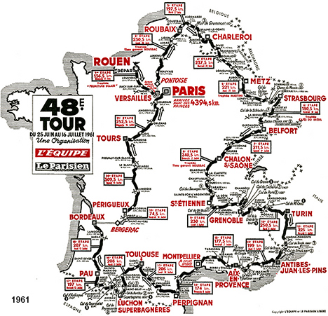 meilleur.Vainqueur le premier jour contre la montre dans son fief, Anquetil prend le maillot jaune à la faveur de la 2ème demi-étape, et après un court intermède de Darrigade, il le conserve jusqu'à Paris malgré une belle course de Charly Gaul dans les Alpes. Les tricolores répriment toutes les attaques et Jacques Anquetil remporte son second Tour sans avoir été mis en danger par ses adversaires dans les Pyrénées ce qui a rendu ce Tour de France assez décevant. Guido Carlesi prend la deuxième place à Charly Gaul, le dernier jour, pour deux secondes. Le parcours - Les partants - Les étapes - Les classements Histoire des maillots ![]() maillots : Jean-Louis Bey Étapes du 25 juin au 16 juillet 1961 1-1 Rouen - Versailles, 136.5 km 1-2 Versailles, 28.5 km CLM 2 Pontoise - Roubaix, 230.5 km 3 Roubaix - Charleroi, 197.5 km 4 Charleroi - Metz, 237.5 km 5 Metz - Strasbourg, 221 km 6 Strasbourg - Belfort, 180.5 km 7 Belfort - Chalon-sur-Saône, 214.5 km 8 Chalon-sur-Saone - Saint-Étienne, 240.5 km 9 St Etienne-Grenoble, 230 km 10 Grenoble - Torino, 250.5 km 11 Torino - Antibes, 225 km 12 Antibes - Aix-en-Provence, 199 km 13 Aix-en-Provence - Montpellier, 177.5 km 14 Montpellier - Perpignan, 174 km 15 Perpignan - Toulouse, 206 km 16 Toulouse - Luchon/Superbagnères, 208 km 17 Luchon - Pau, 197 km 18 Pau - Bordeaux, 207 km 19 Bergerac - Périgueux, 74.5 km CLM 20 Périgueux - Tours, 309.5 km 21 Tours - Paris, 252.5 km La petite histoire : - Darrigade gagne pour la cinquième fois la première étape et portera le maillot jaune une demi-journée. - Le classement général du Challenge Martini (par équipes) est établi au nombre de victoires journalières (2èmes et 3èmes places pour départager) Les nouveautés : - Villes étapes inédites: Pontoise, Antibes/Juan-les-Pins, Luchon/Superbagnères, Bergerac, Périgueux. - Ascensions inédites : Col du Donon, Col de la Schlucht, Superbagnères. Sponsors : - Classement général (maillot jaune) : / - Prime maillot jaune journalière : SHELL BERRE - Classement par points (maillot vert) : PIERJAC - Étapes : sponsor à chaque étape. - Challenge international (équipes) : MARTINI - Grand Prix de la montagne : ST-RAPHAEL-QUINQUINA - Combativité : SOUPLEDUR - Malchance : L'UNION ![]() ITALIE Directeur sportif : Antonio COVOLO ![]() 1 ACCORDI Renzo (Ita) 2 BATTISTINI Graziano (Ita) ab.11° 3 BONI Guido (Ita) np.14° 4 BRUGNAMI Carlo (Ita) ab.12° 5 CARLESI Guido (Ita) 6 FALASCHI Roberto (Ita) 7 FAVERO Vito (Ita) ab.8° 8 MASSIGNAN Imerio (Ita) 9 MINIERI Mario (Ita) 10 PELLEGRINI Armando (Ita) 11 PIZZOGLIO Ezio (Ita) ab.2° 12 ZAMBONI Adriano (Ita) FRANCE Directeur sportif : Marcel BIDOT ![]() 13 ANGLADE Henry (Fra) 14 ANQUETIL Jacques (Fra) 15 CAZALA Robert (Fra) 16 DARRIGADE André (Fra) 17 EVERAERT Pierre (Fra) 18 FORESTIER Jean (Fra) 19 PRIVAT René (Fra) ab.2° 20 GROUSSARD Joseph (Fra) 21 MAHÉ François (Fra) hd.2° 22 MASTROTTO Raymond (Fra) 23 ROSTOLLAN Louis (Fra) 24 STABLINSKI Jean (Fra) BELGIQUE Directeur sportif : Georges RONSSE ![]() 25 ADRIAENSENS Jan (Bel) 26 AERENHOUTS Frans (Bel) 27 CLAES Jean-Baptiste (Fra) 28 DAEMS Emile (Bel) ab.10° 29 HOEVENAERS Jos (Bel) 30 PAUWELS Eddy (Bel) 31 PLANCKAERT Jozef (Bel) 32 PROOST Louis (Bel) hd.7° 33 VAN AERDE Michel (Bel) 34 VANDERVEKEN René (Bel) hd.7° 35 VAN GENEUGDEN Martin (Bel) 36 VLOEBERGHS Jozef (Bel) hd.7° ESPAGNE Directeur sportif : Gabriel SAURA ![]() 37 ALOMAR Jaime (Esp) hd.2° 38 BERTRAN Antonio (Esp) hd.7° 39 CAMPILLO Juan (Esp) 40 GOMEZ DEL MORAL José (Esp) hd.2° 41 ITURAT Vicente (Esp) 42 MANZANEQUE Fernando (Esp) 43 MARIGIL René (Esp) 44 MORALES Carmelo (Esp) hd.2° 45 OTANO Luis (Esp) 46 PACHECO Miguel (Esp) ab.2° 47 PEREZ-FRANCES José (Esp) 48 SAN EMETERIO Julio (Esp) HOLLANDE Directeur sportif : Klaus BUCHLY ![]() 49 DAMEN Piet (Hol) 50 DE HAAN Johan (Hol) ab.9° 51 ENTHOVEN Dick (Hol) hd.10° 52 GELDERMANS Albertus (Hol) ab.6° 53 KERSTEN Jaap (Hol) 54 LAHAYE Jef (Hol) ab.11° 55 NIESTEN Coen (Hol) ab.9° 56 VAN EST Piet (Hol) hd.17° 57 VAN EST Wim (Hol) ab.9° 58 VAN DER STEEN Antoon (Hol) 59 WAGTMANS Wout (Hol) ab.9° 60 WESTDORP Jan (Hol) ALLEMAGNE Directeur sportif : KANTERS ![]() 61 BORGHARD Josef (All) hd.6° 62 DONIKE Manfred (All) hd.6° 63 FISCHERKELLER Friedhelm (All) ab.17° 64 JAROSCEWICZ Hans (All) ab.2° 65 JUNKERMANN Hans (All) 66 KEMPER Dieter (All) hd.6° 67 KUCKELKORN Helmut (All) hd.2° 68 OLDENBURG Horst (All) hd.6° 69 POMMER Reinhold (All) ab.2° 70 PUSCHEL Dieter (All) 71 RENZ Siegfried (All) ab.10° 72 TROCHE Ludwig (All) hd.6° SUISSE / LUXEMBOURG Directeur sportif : Alex BURTIN ![]() 73 GALLATI Fritz (Sui) 74 GIMMI Kurt (Sui) ab.2° 75 GRAF Rolf (Sui) 76 LUISIER Jean (Sui) hd.7° 77 RUCHET Serge (Sui) 78 RUEGG Alfred (Sui) 79 BLEY Raymond (Lux) hd.6° 80 BOLZAN Aldo (Lux) 81 ERNZER Marcel (Lux) 82 GAUL Charly (Lux) 83 SINTGES Jean-Pierre (Lux) ab.10° 84 THULL Roger (Lux) hd.12° GRANDE BRETAGNE Directeur sportif : MATER ![]() 85 BRITTAIN Stan (Gbr) ab.4° 86 COE Ron (Gbr) ab.5° 87 DENSON Vic (Gbr) ab.9° 88 ELLIOTT Seamus (Irl) 89 HITCHEN Albert (Gbr) ab.4° 90 LAIDLAW Ken (Gbr) 91 MOORE Ian (Irl) ab.3° 92 O'BRIEN George (Gbr) ab.3° 93 RYALL Peter (Gbr) hd.3° 94 RYAN Sean (Gbr) hd.2° 95 ROBINSON Brian (Gbr) 96 SIMPSON Tom (Gbr) ab.3° PARIS - NORD-EST Directeur sportif : Jean MAZIER ![]() 101 BOUVET Albert (Fra) ab.12° 102 DUEZ Henri (Fra) ab.2° 103 GAUDRILLET Philippe (Fra) ab.6° 104 GENESTE André (Fra) 105 GERUSSI Elio (Fra) 106 HOORELBEKE Raymond (Fra) 107 LACH Stéphane (Fra) 108 LE DISSEZ André (Fra) ab.17° 109 LEFEVRE jean-Claude (Fra) 110 SAUVAGE Jean-Claude (Fra) hd.6° 111 VIOT Bernard (Fra) 112 WASKO Joseph (Fra) CENTRE - MIDI Directeur sportif : Adolphe DELEDDA ![]() 113 ABATE Antoine (Fra) 114 BERGAUD Louis (Fra) 115 BUSTO Emmanuel (Fra) 116 DOTTO Jean (Fra) 117 HUOT Valentin (Fra) 118 LE MENN Camille (Fra) ab.12° 119 MATTIO Claude (Fra) 120 MILESI Jean (Fra) 121 NOVAK Anatole (Fra) ab.10° 122 ROHRBAC