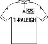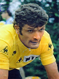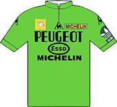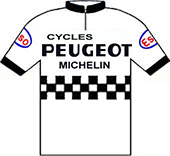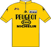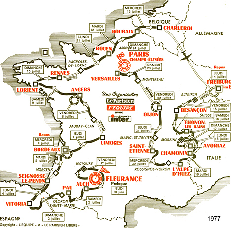 réalise son dernier Tour de France qu'il termine à la 6ème place.Une 64ème édition passionnante ! Le parcours - Les partants - Les étapes - Les classements Histoire des maillots ![]() profils : journal l'Équipe et Le Parisien. maillots : Jean-Louis Bey Étapes du 30 juin au 24 juillet 1977 Prol. Fleurance, 5 km CLM 1 Fleurance - Auch, 237 km 2 Auch - Pau, 253 km 3 Oloron-Sainte-Marie - Vitoria (Esp), 248.2 km 4 Vitoria - Seignosse-le-Penon, 256 km 5-1 Morcenx - Bordeaux, 138.5 km 5-2 Bordeaux/Circuit du Lac, 30.2 km CLM 6 Bordeaux - Limoges, 225.5 km 7-1 Jaunay-Clan - Angers, 139.5 km 7-2 Angers, 4.5 km CLM par équipes 8 Angers - Lorient, 246.5 km 9 Lorient - Rennes, 187 km 10 Bagnoles-de-l'Orne - Rouen, 174 km 11 Rouen - Roubaix, 242.5 km 12 Roubaix - Charleroi, 192.5 km 13-1 Freibourg im Breisgau (All), 46 km 13-2 Altkirch - Besançon, 159.5 km 14 Besançon - Thonon-les-Bains, 230 km 15-1 Thonon-les-Bains - Morzine, 105 km 15-2 Morzine-Avoriaz, 14 km CLM 16 Morzine - Chamonix, 121 km 17 Chamonix - L'Alpe-d'Huez, 184.5 km 18 Voiron - Saint-Étienne, 199.5 km 19 Saint-Trivier - Dijon, 171.5 km 20 Dijon - Dijon, 50 km CLM 21 Montereau - Versailles, 141.5 km 22-1 Paris/Champs Elysées, 6 km CLM 22-2 Circuit des Champs Élysées, 90.7 km La petite histoire : - Dietrich Thurau, jeune allemand de 22 ans, gagne la grande étape pyrénéenne Auch-Pau ainsi que l'étape contre-la-montre de Bordeaux (30 km) à plus de 46 km/h de moyenne, prenant 50 secondes à Merckx et plus d'une minute à Thévenet. Il portera le maillot jaune pendant deux semaines mais le perd après un fléchissement dans les Alpes. - Apogée de Thévenet qui prend le maillot après le contre-la-montre de Dijon. Déclin de Merckx, malade, qui ne termine que 6ème à 12'38". - Maillot blanc du meilleur jeune : Thurau. - Echappée fleuve de Bernard Quilfen : 222 km. Les nouveautés : - Création du challenge par équipe aux points. - Nouvelles villes étape : Vitoria (Esp), Seignosse-le-Penon. - Ascensions inédites : Pas de Morgins. Les barêmes : Pas de bonifcations en temps sur les étapes. Points pour le maillot vert : - étapes de plaine : 25 pts, 20, 16, 14, 12, 10, 9, 8, 7, 6, 5, 4, 3, 2, 1 aux 15 premiers. - étapes de montagne : 15 pts, 14, 13, 12, 11, 10, 9, 8, 7, 6, 5, 4, 3, 2, 1 aux 15 premiers - étapes CLM : 12 pts, 10, 8, 7, 6, 5, 4, 3, 2, 1 aux 10 premiers - prologue et demi-étapes CLM : 8 pts, 6, 5, 4, 3, 2, 1 aux 7 premiers - "rush" : 4 pts, 2 & 1 pt Un classement des "rush" est établi séparément, chaque point-chaud attribuant : 6 pts, 4, 3, 2 & 1 aux 5 premiers. Points pour la montagne : - 1ère catégorie : 20 pts, 16, 14, 12, 10, 8, 6, ..., 1 aux 12 premiers - 2ème catégorie : 15 pts, 12, 10, 8, 6, 5, ..., 1 aux 10 premiers - 3ème catégorie : 8 pts, 6, 4, 3, 2, 1 aux 6 premiers - 4ème catégorie : 3 pts, 2, & aux 3 premiers Meilleur rouleur : par addition des chronos de Fleurance, Bordeaux, Avoriaz, Dijon & Champs-Élysées. Les sponsors : - Étapes : / - Classement général, "maillot jaune" : MIKO - Classement individuel par points, "maillot vert" : MICHELIN - Classement équipes par points : MICHELIN - Grand Prix de la Montagne : Chocolat POULAIN - Grand Prix des jeunes : ALFA-LAVAL - Rush : SIMCA - Challenge international par équipes : LE COQ SPORTIF - Prix de la combativité : LA REDOUTE - Amabilité : BNP - La meilleure échappée : EDOX - Le ruban bleu : ADIDAS ![]() LEJEUNE-BP Directeur sportif : Henry Anglade & Pierre SCHOOR ![]() 1 VAN IMPE Lucien (Bel) 2 BAZZO Pierre (Fra) np.10° 3 BRACKE Ferdinand (Fra) hd.17° 4 DILLEN René (Bel) hd.17° 5 GUTIEREZ Antoine (Fra) hd.17° 6 JULIEN Ferdinand (Fra) 7 LE DENMAT Michel (Fra) 8 LEGEAY Roger (Fra) 9 PLET Eugène (Fra) 10 SCHUITEN Roy (Hol) hd.17° MIKO-MERCIER-HUTCHINSON Directeur sportif : Louis CAPUT & Maurice QUENTIN ![]() 11 ZOETEMELK Joop (Hol) 12 BERTIN Yvon (Fra) hd.16° 13 DELISLE Raymond (Fra) 14 HOBAN Barry (Gbr) 15 LE GUILLOUX Maurice (Fra) ab.14° 16 MARTIN Raymond (Fra) 17 PERRET Patrick (Fra) np.20° 18 ROUXEL Charly (Fra) hd.17° 19 SEZNEC Christian (Fra) 20 VALLET Bernard (Fra) PEUGEOT-ESSO-MICHELIN Directeur sportif : Maurice DE MUER & Robert NAEYE ![]() 21 THÉVENET Bernard (Fra) 22 BEON Patrick (Fra) hd.17° 23 BOURREAU Bernard (Fra) 24 DANGUILLAUME Jean-Pierre (Fra) 25 DELÉPINE Régis (Fra) hd.17° 26 ESCLASSAN Jacques (Fra) 27 LAURENT Michel (Fra) 28 OVION Régis (Fra) 29 SIBILLE Guy (Fra) 30 TALBOURDET Georges (Fra) hd.17° KAS-CAMPAGNOLO Directeur sportif : Antonio BARRUTIA ![]() 31 GALDOS Francisco (Esp) 32 ANDIANO Julian (Esp) hd.17° 33 CIMA José-Enrique (Esp) 34 LOPEZ-CARRIL Vicente (Esp) 35 MARTINEZ-HEREDIA Enrique (Esp) 36 MARTINS José (Por) 37 MENENDEZ Antonio (Esp) 38 NAZABAL José (Esp) np.16° 39 PESARRODONA José (Esp) ab.2° 40 POZO Sebastian (Esp) ab.18° FRISOL-GAZELLE-THIRION Directeur sportif : Florent VAN VAERENBERGH & Edgar DE MAERE ![]() 41 OCANA Luis (Esp) 42 DEN HERTOG Fedor (Hol) ab.13b° 43 LOYSCH Roger (Bel) 44 RAAS Jan (Hol) np.15a° 45 ROMERO André (Fra) ab.2° 46 ROSIERS Roger (Bel) hd.17° 47 SCHEPMANS Benny (Bel) hd.9° 48 SMIT Theo (Hol) ab.14° 49 WELLENS Paul (Bel) 50 WESEMAEL Wilfried (Bel) hd.17° GITANE-CAMPAGNOLO Directeur sportif : Cyrille GUIMARD & Maurice CHAMPION ![]() 51 MESLET Alain (Fra) 52 BOSSIS Jacques (Fra) hd.17° 53 BERLAND Roland (Fra) 54 CHALMEL André (Fra) 55 CHASSANG Jean (Fra) hd.17° 56 MINTKIEWICZ Robert (Fra) hd.15b° 57 MONEYRON Gérard (Fra) hd.17° 58 QUILFEN Bernard (Fra) hd.17° 59 TEIRLINCK Willy (Bel) hd.17° 60 VILLEMIANE Pierre-Raymond (Fra) TEKA Directeur sportif : Julio SAN EMETERIO & Miguel MORENO ![]() 61 TORRES Pedro (Esp) 62 AJA Gonzalo (Esp) 63 AGOSTINHO Joaquim (Por) 64 ALFONSEL Bernardino (Esp) hd.17° 65 BALAGUE Luis (Esp) 66 ESPARZA Manuel (Esp) ab.5° 67 GANDARIAS Andres (Esp) 68 MELERO Carlos (Esp) hd.17° 69 MENDES Fernando (Esp) 70 THALER Klaus-Peter (All) hd.17° FIAT Directeur sportif : Raphaël GÉMINIANI & Robert LELANGUE