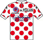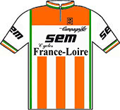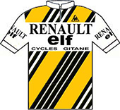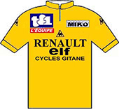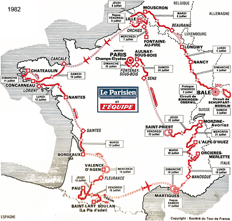 et 4° places. Sean Kelly remporte le maillot vert.Bernard Hinault remporte son 4ème Tour de France et semble bien parti pour faire aussi bien ou mieux que Merckx et Anquetil. Le parcours - Les partants - Les étapes - Les classements Histoire des maillots ![]() carte : Société du Tour de France profils : journal l'Equipe & Le Parisien maillots : Jean-Louis Bey Étapes du 2 au 25 juillet 1982 Prologue Bâle (Sui), 7.4 km CLM 1 Circuit de Schupfart - Möhlin (Sui), 207 km 2 Bâle - Nancy, 250 km 3 Nancy - Longwy, 134 km 4 Beauraing - Mouscron, 219 km 5 6 Lille - Lille, 233 km 7 Cancale - Concarneau,234.5 km 8 Concarneau - Chateaulin, 200.8 km 9-1 Lorient - Plumelec, 69 km CLM par équipes 9-2 Plumelec - Nantes, 132 km 10 Saintes - Bordeaux, 147.2 km 11 Valence d'Agen, 57.3 km CLM 12 Fleurance - Pau, 249 km 13 Pau - Saint-Lary-Soulan/Plat d'Adet, 121 km 14 Martigues, 32.5 km CLM 15 Manosque - Orcières-Merlette, 204 km 16 Orcières-Merlette - L'Alpe-d'Huez, 123 km 17 Bourg-d'Oisans - Morzine, 244 km 18 Morzine - Saint-Priest, 233 km 19 Saint-Priest - Saint-Priest, 48 km CLM 20 Sens - Aulnay-sous-Bois, 161 km 21 Fontenay-sous-Bois - Paris/Champs Elysées, 186.8 km La petite histoire : - A noter 4 contre-la-montre individuels (dont le prologue) et 1 contre-la-montre par équipes ! - L'étape contre la montre par équipes Orchies - Fontaine au Pire est annulée en raison d'une manifestation de sidérurgistes et sera remplacée par la demi-étape Lorient-Plumelec. Journée de transfert vers la Bretagne le vendredi 9 juillet. Journée de repos le samedi 17 juillet à Martigues. Les classements : Montagne : cat.HC : 25, 20, 18, 16, 14, 12, 10, 8, 7, ..., 1 pt cat.1 : 20, 16, 14, 12, 10, 8, 6, 5, ..., 1 pt cat.2 : 15, 12, 10, 8, 6, 5, ... 1 pt cat.3 : 8, 6, 4, 3, 2, 1 pt cat.4 : 4, 2, 1 pt Points : Prol. : 6, 5, 4, 3, 2, 1 pt Plat : 35, 30, 26, 22, 18, 15, 12, 10, 8, 6, 5, ..., 1 pt Montagne : 12, 11, ..., 1 pt CLM : 10, 8, 6, 5, ..., 1 pt Rush : 8, 5, 3 pt (certains sprints donnent droit à des bonifications en temps). Les nouveautés : - Nouvelles villes étapes : Mouscron, Concarneau, Plumelec. - Cols ou ascensions inédits : Chaillolet, Espreaux, Fort de Montperché, Serre-Heyraud. Les sponsors : - Étapes : MERLIN-Plage - Classement général, "maillot jaune" : MIKO - Classement individuel par points, "maillot vert", et des équipes par points : MICHELIN - Classement du meilleur grimpeur, "maillot à pois" : Chocolat POULAIN - Classement du meilleur jeune, "maillot blanc" : X-TRA - Classement "combiné" : Grand Prix TF1 - Sprints "rush" : TALBOT - Classement au temps par équipes : CRÉDIT LYONNAIS - Le prix de la combativité : BANANIA - Divers : Fair-Play "WOLBER", Équipier "BNP", Amabilité "TERA-XYL" ![]() RENAULT-ELF-GITANE Directeur sportif : Cyrille GUIMARD & Bernard QUILFEN ![]() 1 HINAULT Bernard (Fra) 2 ARBES Hubert (Fra) 3 BERARD Charly (Fra) 4 BONNET Patrick (Fra) 5 DIDIER Lucien (Lux) 6 LE GUILLOUX Maurice (Fra) 7 MADIOT Marc (Fra) 8 POISSON Pascal (Fra) 9 RODRIGUEZ Jean-François (Fra) 10 VIGNERON Alain (Fra) LA REDOUTE-MOTOBECANE Directeur sportif : Philippe CRÉPEL & Jos BRAECKEVELT ![]() 11 ALBAN Robert (Fra) 12 BAZZO Pierre (Fra) 13 DE MUYNCK Johan (Bel) 14 DE WILDE Etienne (Bel) ab.16° 15 GUYOT Pascal (Fra) 16 JOURDAN Christian (Fra) ab.17° 17 SHERWEN Paul (Gbr) 18 VALLET Bernard (Fra) 19 VANDENBROUCKE Jean-Luc (Bel) ab.8° 20 VANOVERSCHELDE Didier (Fra) TI RALEIGH-CAMPAGNOLO-MERCKX Directeur sportif : Peter POST & Jules DE WEVER ![]() 21 VAN DE VELDE Johan (Hol) 22 HOSTE Frank (Bel) np.17° 23 DE KEULENAER Ludo (Bel) 24 KNETEMANN Gerrie (Hol) 25 LUBBERDING Henk (Hol) 26 PEETERS Ludo (Bel) 27 RAAS Jan (Hol) ab.15° 28 VAN VLIET Leo (Hol) 29 VELDSCHOLTEN Gérard (Hol) 30 WIJNANDS Ad (Hol) CAPRI SONNE-CAMPAGNOLO-MERCKX Directeur sportif : Walter GODEFROOT & Patrick LEFEVERE ![]() 31 WINNEN Peter (Hol) 32 BRAUN Gregor (All) ab.7° 33 DELCROIX Ludo (Bel) 34 DE ROOY Theo (Hol) 35 DE WITTE Ronald (Bel) 36 McKENZIE Eric (Nzl) 37 PEVENAGE Rudy (Bel) 38 VAN DE WIELE Eric (Bel) 39 WAYENBERG Dirk (Bel) 40 WILMANN Jostein (Nor) ab.17° PEUGEOT-SHELL-MICHELIN Directeur sportif : Maurice DE MUER & Roland BERLAND ![]() 41 BERNAUDEAU Jean-René (Fra) 42 ANDERSON Phil (Aus) 43 BOURREAU Bernard (Fra) ab.17° 44 BRUN Frédéric (Fra) 45 CHALMEL André (Fra) 46 DUCLOS-LASSALLE Gilbert (Fra) 47 LAURENT Michel (Fra) 48 LINARD Hubert (Fra) 49 PERRET Patrick (Fra) 50 SIMON Pascal (Fra) WICKES-BOUWMARKT-SPLENDOR Directeur sportif : Albert DE KIMPE & Luc LANDUYT ![]() 51 CRIQUIELION Claude (Bel) ab.17° 52 BROERS Johnny (Hol) ab.2° 53 DESMET Luc (Bel) ab.15° 54 PLANCKAERT Eddy (Bel) ab.17° 55 PLANCKAERT Walter (Bel) ab.12° 56 SCHIPPER Adri Jos (Hol) np.17° 57 URBANY Eugène (Lux) 58 VAN BRABANT Benny (Bel) 59 VANDENBRANDE Jean-Philippe (Bel) 60 WELLENS Paul (Bel) np.18° VERMEER-THIJS-GIOS Directeur sportif : Roger SWERTS & Jos DE WOLF ![]() 61 DE WOLF Fons (Bel) 62 DE CNIJF Roger (Bel) 63 DE GENDT Frankie (Bel) hd.18° 64 DE SCHOENMAECKER Joseph (Bel) ab.3° 65 JACOBS Jos (Bel) ab.17° 66 LUYTEN Louis (Bel) 67 SCHOONBAERT Danny (Bel) 68 VAN HOUWELINGEN Adrie (Hol) 69 VAN HOUWELINGEN Jan (Hol) 70 VERSCHUERE Pol (Bel) SEM-FRANCE LOIRE-CAMPAGNOLO Directeur sportif : Jean DE GRIBALDY & Brik SCHOTTE ![]() 71 KELLY Sean (Irl) 72 BITTINGER René (Fra) 73 BOYER Jonathan (Usa) 74 CHAPPUIS André (Fra) 75 CHAURIN Jean-François (Fra) 76 CLERC Patrick (Fra) 77 GALLOPIN Guy (Fra) ab.13° 78 GARDE Dominique (Fra) 79 GRAIGNIC Hubert (Fra) 80 TINAZZI Marcel (Fra) SUNAIR-COLNAGO-CAMPAGNOLO Directeur sportif : Guillaume DRIESSENS & Willy JOSSART ![]() 81 WILLEMS Daniel (Bel) 82 DE ROO Alain (Bel) 83 DEVOS Werner (Bel) 84 FRIJNS Ludo (Bel) ab.16° 85 JANISZEWSKI Guy (Bel) 86 VAN VLIERBERGHE Frans (Bel) 87 VERLINDEN Gery (Bel) np.17° 88 VERSLUYS Patrick (Bel) 89 WIJNANTS Jan (Bel) ab.17° 90 WIJNANTS Ludwig (Bel) DAF TRUCKS-TEVE BLAD-ROSSIN Directeur sportif : Fred DE BRUYNE & José DE CAUWER ![]() 91 KU