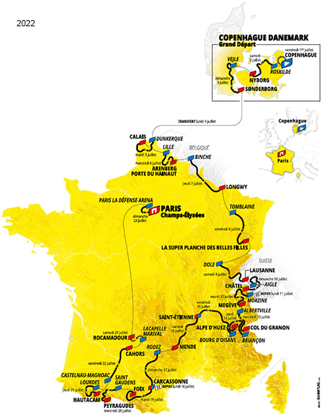 - Le Tour s'élance pour la 1ère fois du Danemark où 3 étapes seront disputées.