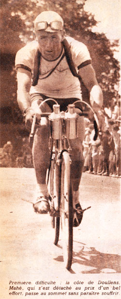 - C'est en entrant à Doullens que l'Italien Bertocchi lance l'offensive en compagnie du Belge Impanis. André Mahé vint bientôt se joindre aux fugitifs mais la crevaison de Bertocchi permet au peloton de revenir sous l'impulsion d'Emile Idée. Dans la fameuse côte de Doullens, Mahé en verve repart et compte au sommet une dizaine de secondes d'avance sur Tacca, Ronconi, Bizzi etc... En vue d'Arras, le peloton est éparpillé et il ne reste qu'environ 25 coureurs bien groupés parmi lesquels Kübler, Mahé, Cogan, Robic, Vietto, Impanis, Ronconi, Bizzi, Bobet, Idée etc... des coureurs comme Diot, Sercu, De Muer, Lazaridès, Néri... ont été lâchés et sont virtuellement battus. Thiétard tombe peu après, se casse la clavicule et abandonne.