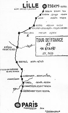 - Dans la traversée de Lens, Danguillaume lâche tout le monde au train et poursuit son effort. Il compte 1'10" d'avance entre Carvin et Seclin. C'est à ce moment que l'on retrouve un air de Paris-Roubaix dans la poussière et les pavés. Danguillaume, sur ces pavés, perd du terrain et se fait reprendre à l'entrée de Lille. L'intenable Mahé démarre alors. Il est rejoint par Kübler, les deux coureurs s'élancent sur la cendrée de l'hippodrome où ils ont 1875 m à parcourir. Kübler l'emporte mais Mahé, tassé, ne dispute pas le sprint et s'estime lésé. Les commissaires ne changent pas d'avis et Kübler est le premier porteur du maillot jaune depuis 1939 !
