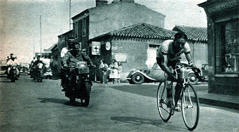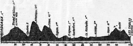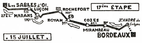 - Ils ateignent, toujours groupés, Rochefort (km 148) où le temps est beaucoup plus clément. A la sortie de la ville, Lucas tente de partir avec dans son sillage Robic et Ronconi. Le peloton réagit vivement et neutralise l'action. A Luçon, au km 223, Tassin surprend tout le monde et file seul. Gauthier tout d'abord puis Diederich se lancent à la poursuite du fuyard.