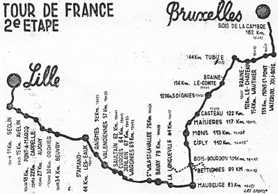 - Dès le départ de Lille, Pawlisiak et B. Gauthier provoquent une échappée. Le soleil et les pavés créent très vite des ravages dans les rangs. A Raismes, Vietto est en tête avec Géminiani, Gauthier, Pawlisiak, Klabinski, Schotte et Breuer et il s'en va bientôt au train. Il accélère encore le rythme pour passer à Valenciennes avec une vingtaine de secondes d'avance. Derrière c'est "la chasse à la canette". Le Tour franchit ensuite la frontière et tous les Belges sont sur le pas de la porte !