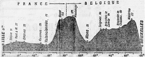 12h00 (Nord) : Lille / pte d'Arras (km 0) - Seclin (km 11) - Avelin (km 15) - Pont-à-Marcq (km 18) - Cappelle (km 22) - Auchy (km 27) - Orchies (km 30) - Beuvry (km 34) - Saint-Amand-les-Eaux (km 44) - Raismes (km 52) - Valenciennes (km 57) - Saultain (km 62) - Curgies (km 64) - Jenlain (km 67) - Wargnies (km 69) - Saint-Waast-la-Vallée (km 76) - Bavay (km 79) - La Longueville (km 84) - Maubeuge (km 93) - Bettignies (km 99) - Douane française - (BELGIQUE) - Bois-Bourdon / douane belge (km 101) - Ciply (km 110) - Mons (km 113) - Maisières (km 117) - Casteau (km 122) - Soignies (km 129) - Braine-le-Comte (km 136) - Tubize (km 146) - Clabecq (km 148) - Braine-le-Château (km 152) - Wouthier (km 154) - Mont-Saint-Pont (km 159) - Waterloo-JoIibois - Groenendael / Viaduc (km 173) - Bruxelles / Bois de la Combre (km 182).