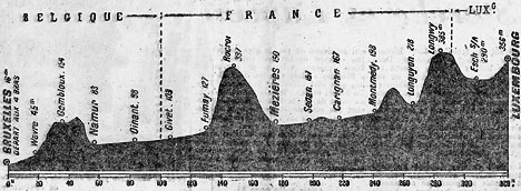 - Le peloton roule lentement et bien groupé pendant 175 km, les coureurs se contentent de faire la chasse à la canette le long des rives sinueuses de la Meuse et ne se préoccupent pas de l'échappée de Delille parti seul à l'exception de Diot et Bourlon lancés à sa poursuite. A Namur, il est 2' devant le peloton, à Givet l'écart est de 7'30" et 13'15" d'avance à Charleville où le peloton passe au grand complet. Delille s'écroulera bien avant l'arrivée, rejoint par Ronconi près de Sedan puis il va abandonner.