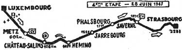 - Le début de l'étape est une longue séance de train monotone jusqu'à 40 kilomètres de Strasbourg, mais il faut noter qu'avant la décision qui va se produire à Saverne, Robic une première fois, puis Jean-Marie Goasmat avaient essayé de s'enfuir mais le vent est violent et les deux Bretons se relèvent. C'est dans la descente du col de Saverne que le peloton de disloque. Rémy, Pawlisiak & Fachleitner s'échappent et entrent en premier dans Saverne. A la sortie de la ville, dans une côte, Robic, Impanis, Schotte, Kübler, Diot, Massal reviennent sur les trois fuyards mais Robic profite de la montée suivante pour démarrer et s'enfuir avec Kübler et Diot qui est le meilleur sprinter des trois mais ce dernier faiblit et il est décroché au train. Kübler crève dans les faubourgs de Strasbourg et fait à plat les 4 derniers kilomètres. Robic traverse Strasbourg au sprint et gagne sur le circuit du Parc de Contades.