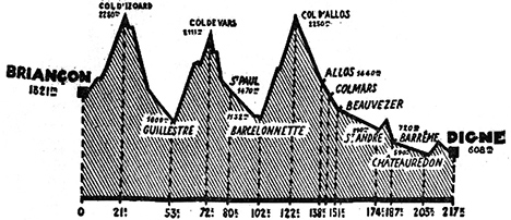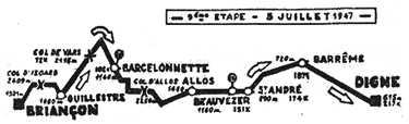 - Encore une fois Vietto fait une descente "à tombeau ouvert" dans les lacets qui conduisent à Jausiers montrant qu'on peut aussi gagner un Tour dans les descentes. Devant Brambilla et Robic doivent changer à deux reprises leur boyau perdant de précieuses minutes. Muller et Bobet chutent avant Barcelonnette. Bobet est contraint à l'abandon. En tête avant Allos on ne trouve que les deux Cannois Vietto et Lazaridès. A mi-col d'Allos, les positions sont les suivantes : Vietto & Lazaridès suivis à 2'45" de Brambilla, à 5'20" de Robic. Ronconi pointe à 7'. Devant Lazaridès et Vietto se relayent d'autant que Vietto est virtuel maillot jaune depuis Barcelonnette. Au sommet (km 122) : Vietto & Lazaridès,