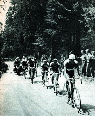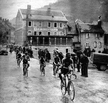 - Dès le départ, Bonnaventure & De Gribaldy, malades toute la nuit, ont du mal à suivre. Heureusement la moyenne horaire est faible, chacun attendant visiblement le dernier col comptant pour le G.P de la Montagne : Vue des Alpes. Lapébie chute sans gravité dans la traversée de Neuchâtel et rentre sans problème.