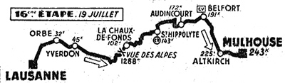 9h00 Lausanne (km 0) - Cossonay (km 18) - Orbe (km 32) - Yverdon (km 45) Vaumarcus (km 62) - Valangin (km 84.5) - Boudevilliers (km 88) - Vue des Alpes (km 94.5-GPM B) - Chaux-de-Fonds (km 102) - Bianfond / frontière (km 115) - Charquemont (km 125) - St-Hippolyte (km 143-ravitaillement) - Pont-de-Roide (km 155) - Mandeure (km 164) - Valentigney (km 169) - Sochaux (km 176) - Chatenos (km 181) - Belfort (km 191) - Bessoncourt (km 198) - Foussemagne (km 205) - Dannemarie (km 214.5) - Altkirch (km 225) - Mulhouse / PL. du 14 juillet (km 243).