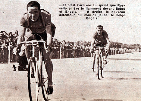 - Le peloton au cours de la poursuite se scinde tandis que Engels puis Rossello rejoignent les deux Français de devant. A Dinan au km 235, Sciardis et Janssen passent à 2' des leaders, un groupe de 17 poursuivants passe à 2'15" tandis que le peloton maillot jaune (Bartali) passe à 3'. A 20 km du but, Georges Martin paye ses efforts et décroche du groupe de tête. Bobet met du coeur à l'ouvrage car une victoire à Dinard lui assurerait le maillot jaune. Mais c'est une deuxième victoire italienne avec Rossello et c'est Engels le "cadet belge" qui, tout heureux, endosse le maillot jaune. Lucien Teisseire règle le groupe des poursuivants, Bartali passe avec le peloton à 4'28".