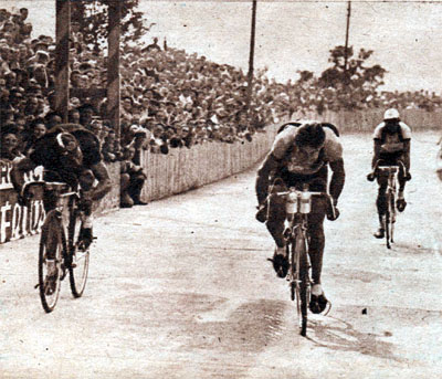 - Les deux pelotons Bartali et Bobet font la jonction. A La Chaize le Vicomte (km 72.5), Lambrecht et Pras sortent des rangs pour courir après les fuyards qui possèdent à ce moment environ 3' d'avance. Bobet qui avait répondu lui-même à une dizaine de tentatives d'échappée, ne répond pas à celle-là. A Ste Hermine (km 95), Bonnaventure, Sciardis et Rolland en tête, à 1'40" Pras, à 1'50" Lambrecht, à 1'55" le groupe Bobet/Bartali, à 3'05" le gros peloton. Après une longue poursuite, le groupe de tête faiblit car c'est Bonnaventure qui fournit le plus gros du travail et l'écart n'est plus que de 1'15" sur les contre attaquants. Pour aider Lambrecht (Internationaux) bien placé pour le maillot jaune (1'26" de retard sur Bobet), Avanti Martinetti le DS de l'équipe des Internationaux fait arrêter Sciardis avant Marans pour attendre les deux poursuivants.