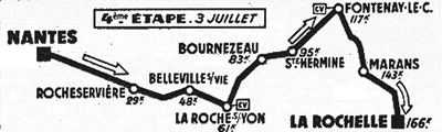 - Malgré un début d'étape tonitruant (près de 50 km/h de moyenne), à St-Philibert de Bouaine (km 23.5), Guégan, Rémy, Klabinski, Pernac, Cottur, Dupont & Jomaux tentent la fuite mais le maillot jaune ne laisse pas faire. Puis Bonnaventure qui se rapproche du pays (La Roche sur Yon) parvient à se détacher avec Sciardis et Rolland. A Belleville sur Vie, ils possèdent 1'05" d'avance sur un groupe intercalé comprenant notamment Teisseire, Rémy et Pras, 1'20" sur un peloton de 18 coureurs parmi lesquels Bartali et Schotte et 1'30" sur le gros peloton emmené vigoureusement par Bobet.