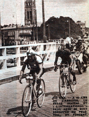 - A Libourne, Paul Néri attaque entraînant avec lui Stan Ockers mais il capitule très vite laissant Ockers seul devant. A Créon, Ockers en tête, à 1'10" le groupe des échappés, à 7'30" Néri à la dérive, 8'15" sur Idée qui a lui aussi complèment "explosé" et qui ne parviendra pas à suivre le peloton, à 13' le peloton.