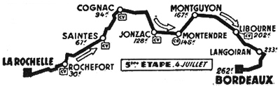 - A 13 km de Bordeaux, Ockers est repris (et va se faire lâcher 10 km plus loin). Les autres arrivent ensemble pour un sprint acharné que Raoul Rémy le régional du Sud-Est remporte. A l'arrière Lambrecht crève et l'on craint un instant qu'il perde son maillot au profit de Sciardis mais Klabinski le dépannera très vite. Lambrecht conserve son maillot jaune mais Teisseire et Sciardis font une bonne opération au classement général.