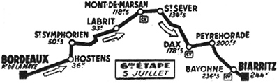 - Au km 50, Thiétard, Bobet et Marie, qui ont rejoint Muller et Joly, comptent 3' d'avance sur le peloton, puis 5' au km 70. Bobet, qui n'a que 3'24" de retard au classement général, a donc virtuellement repris le maillot jaune. A Labrit (km 93), une chute met à terre Teisseire, Volpi, Lazaridès, De Gribaldy, Ramoulux, Caffi et Baratin. Volpi est le plus sérieusement touché et attend la voiture ambulance mais finalement il remonte sur son vélo avec beaucoup de courage. Au ravitaillement de Mont-de-Marsan (km 118), l'écart s'est encore creusé. Il est maintenant de 5'25" sur le peloton, et de 16' sur Volpi et Bonnet victime d'une crevaison. Peu avant Dax (km 173), les cinq échappés perdent Thiétard sur double-crevaison en 5 km. A Dax, il n'a que 45" de retard mais le vent contraire l'empêche de revenir et il se laissera rejoindre à Port-de-Lanne (km 206).