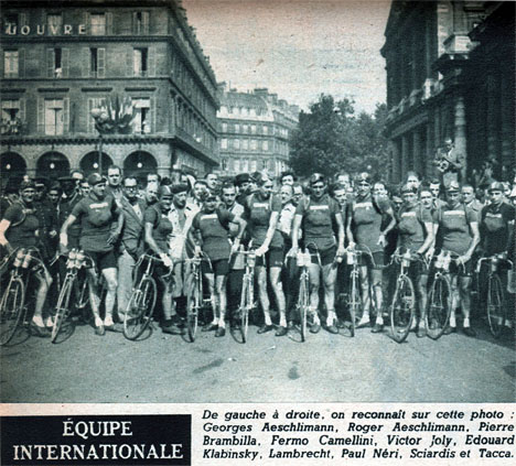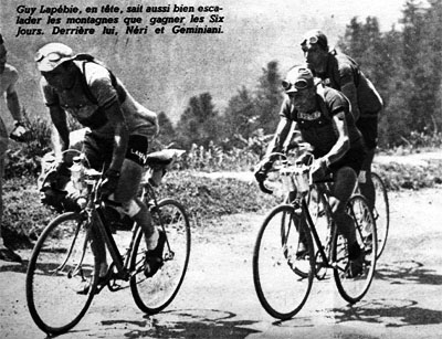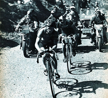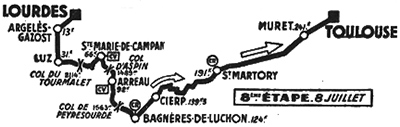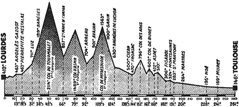 ![]() jeudi 8 juillet 1948 ![]() 8h15 : Lourdes (km 0) - Argelès-Gazost (km 13) - Pierrefitte-Nestalas (km 19.5) - Luz-Saint-Sauveur (km 31) - Barèges (km 38.5) - Col du Tourmalet (km 49.5-GPM A) - Gripp (km 63) - Sainte-Marie de Campan (km 66) - Col d'Aspin (km 79-GPM B) - Arreau (km 92) - Bordères-Louron (km 96.5) - Estarvielle (km 103.5) - Col de Peyresourde (km 109.5-GPM B) - Bagnères de Luchon (km 124-ravitaillement) - Cierp (km 139.5) - Antichan de Frontigne (km 148) - Col des Ares (km 153) - Cazaunous (km 159) - Pujos (km 171) - Saint-Martory (km 191-ravitaillement) - Mancioux (km 194.5) - Martres-Tolosane (km 261) - Noé (km 228) - Muret (km 241) - Toulouse / stade (km 261). ![]() ![]() ![]() 94 partants. Météo : ensoleillé. - Douze hommes se détachent avant le Tourmalet : Molinéris, Thiétard, Corrieri, Danguillaume, Carpentier, De Ruyter, Lambrecht, Géminiani, Piot, Rey, Mathieu, Mathys. Ne voyant pas rejoindre Bartali, Corrieri rentre dans le rang. Un peu plus loin, se joignent Brambilla, Paul Néri, Jean Lauk lequel est très rapidement décramponné, Marie, Lapébie et Camellini qui sera le dernier à faire la jonction. On trouve donc 16 coureurs en tête de la course. Dans les premières rampes du Tourmalet, Carpentier, Marie, Mathieu & Danguillaume ont dû laisser filer leurs camarades tandis que du peloton, pointé à 2'30", sortent Goasmat puis Robic et enfin Lazaridès. Dans le groupe de tête, Néri, Brambilla, Camellini, Lambrecht & Géminiani mènent le train. Marinelli sort du peloton et à mi-col, la situation est la suivante : en tête Néri, Géminiani, Lambrecht... et Robic dont le retour est étonnant, quelques mètres plus loin Brambilla, Molinéris et Lapébie, à 35" Camellini & Thiétard, à 55" Brulé et Bartali, à 1' Piot et Marinelli, à 1'05" Bobet, Lazaridès, De Gribaldy, Ronconi, Mathys, De Ruyter, à 1'55" Ockers et Impanis... à 3' Teisseire, à 5'30" Vietto & Sciardis. Brulé lâche Bartali ! - Au col du Tourmalet (km 49), en tête Robic, à 18" Néri, à 1'13" Brulé, à 1'29" Bartali, à 2'03" Lazaridès, à 2'31" Lambrecht, à 2'59" Lapébie, à 3'24" Marinelli & Cottur, à 3'38" Camellini, Géminiani, Bobet, à 3'57" Brambilla, Molinéris, Ockers, De Gribaldy, Ronconi, à 4'15" Kirchen & Teisseire etc. La descente sur Ste Marie de Campan ne provoque que des regroupements. Robic est rejoint par Bartali et Néri. Thiétard chute et rétrograde. - L'ascension sur le col d'Aspin montre sensiblement les mêmes hommes forts. Au sommet (km 79), en tête Robic, à 2'06" Bartali, à 2'15" Lazaridès, à 4'45" Néri et Lapébie, à 4'50" Lambrecht, à 6'55" Brulé et Teisseire, à 7' Bobet, à 7'19" Vietto, à 7'20" Cottur, à 7'25" Camellini & Kirchen, à 7'35" Tacca, Ockers & Brambilla... Géminiani est à 8'30". Dans la descente, chutes et crevaisons sont au programme. Impanis est très loin deriière. A Arreau au km 92, Robic possède 1'40" d'avance sur Bartali, 2'15" sur Néri, Lazaridès et Lambrecht, 4'55" sur Lapébie, Bobet, Teisseire, Cottur & Brulé, 6'40" sur Vietto etc. - Le dernier grand col de la journée, Peyresourde (km 109.5) est franchi en tête par le même homme Jean Robic qui a engrangé 2' de bonifications sur les 3 cols. A 2'07" on trouve Bartali, à 5'30" Lazaridès, à 5'55" Teisseire, à 6' Bobet, à 6'15" Néri, à 6'24" Lapébie, à 6'27" Lambrecht, à 7'34" Pasquini & Vietto etc. - Bartali rejoint Robic qui, ayant rempli son objectif, ne mène plus et attend le retour de Bobet. Après le col des Ares au km 153, la jonction est faite. La tête de course est maintenant : Bartali, Bobet, Robic, Tacca, Lambrecht, Ockers, Néri, Lazaridès, Teisseire, Vietto, Pasquini, Cottur, Brambilla, Lapébie, Thiétard, Kirchen & Camellini. A 6'30" un groupe avec entr'autres Marinelli, Chapatte, Géminiani, De Gribaldy, Piot, Dupont, Brulé, à 8'35" le groupe Impanis, Cogan, Thuayre, Sciardis, Ronconi, Goasmat & Bonnaventure. L'allure du groupe de tête baisse et le groupe Géminiani en profite pour grossir les rangs à Muret au km 241. - 24 coureurs se disputent la victoire sur la piste cendrée du stadium toulousain. Lapébie est pressenti pour la victoire mais il se fait déborder par Bartali dans le dernier virage. Bobet conserve son maillot jaune. Peu de changement au classement général. Demain, les coureurs profitent d'une journée de repos à Toulouse. ![]() Étape : ![]() 1. Gino Bartali (Ita) en 8h27'25" (moy : 30.862 km/h) 2. Guy Lapébie (Fra) 3. Stan Ockers (Bel) 4. Giuseppe Tacca (Ita) 5. Louis Thiétard (Fra) 6. Giordano Cottur (Ita) 7. Paul Néri (Ita) 8. Jean Robic (Fra) 9. André Brulé (Fra) 10. Lucien Teisseire (Fra) 11. Bernard Gauthier (Fra) 12. Kléber Piot (Fra) 13. Bruno Pasquini (Ita) 14. Jean Kirchen (Lux) 15. Robert Chapatte (Fra) 16. Raphaël Géminiani (Fra) 17. René Vietto (Fra) 18. Louison Bobet (Fra) 19. Fermo Camellini (Ita) 20. Marcel Dupont (Bel) 21. Roger Lambrecht (Bel) 22. Jacques Marinelli (Fra) 23. Apo Lazaridès (Fra) 24. Pierre Brambilla (Ita) 25. Jean De Gribaldy (Fra) à 2'53" 26. Alfred Macorig (Fra) à 3'15" 27. Egidio Feruglio (Ita) 28. Pierre Molinéris (Fra) 29. Georges Martin (Fra) 30. Maurits Meersman (Bel) 31. Enzo Coppini (Ita) 32. Lucien Mathys (Bel) 33. Maurice Diot (Fra) 34. Raymond Impanis (Bel) 35. Robert Bonnaventure (Fra) 36. Daniel Thuayre (Fra) 37. Pierre Cogan (Fra) 38. Aldo Ronconi (Ita) 39. Brik Schotte (Bel) 40. Paul Giguet (Fra) 41. François Hélary (Fra) 42. Gino Sciardis (Ita) 43. Primo Volpi (Ita) 44. Raoul Rémy (Fra) 45. Jean-Marie Goasmat (Fra) 46. Raymond Goussot (Fra) à 7'17" 47. Albert Ramon (Bel) 48. Giovanni Corrieri (Ita) 49. Édouard Muller (Fra) 50. Antonio Bevilacqua (Ita) 51. Jefke Janssen (Hol) 52. Victor Joly (Bel) 53. Robert Desbats (Fra) 54. Florent Rondelé (Bel) 55. Alphonse Devreese (Fra) 56. Édouard Klabinski (Pol) 57. Wim De Ruyter (Hol) 58. Georges Ramoulux (Fra) 59. Serafino Biagioni (Ita) 60. Vittorio Magni (Ita) 61. Edward Van D