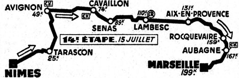 - Au départ, le vent est contraire et personne ne se sent le courage d'attaquer. Marcelak et Massal font une petite tentative, mais ils comprennent rapidement. A Avignon, Kint traverse la Cité des Papes avec une centaine de mètres d'avance sur Apo Lazaridès et Geus et 300 mètres sur le peloton mais il se laisse rejoindre. Lucien Teisseire peine à nouveau, de même que Fachleitner. Dans le peloton regroupé, une vive altercation oppose Vietto à Apo Lazaridès. Ce dernier avait tenté de s'échapper et fut chassé par les Italiens. L'imbuvable Vietto vient à sa hauteur et le gifle. Vexé, Lazaridès se laisse glisser en, queue de peloton et parle de se faire éliminer. Georges Cuvelier, non sans mal, parvient à lui faire entendre raison, et Apo rentre dans le rang.