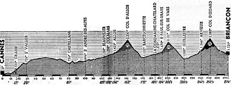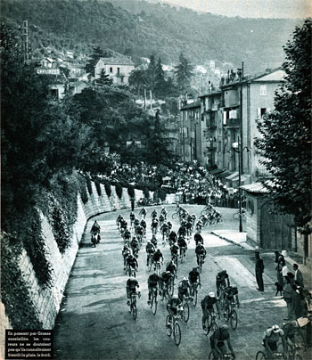 - Dès le départ, Ferdi Kubler se montre. A la sortie de Grasse (km 17), confondant le col du Pilon (ou de Grasse) et Allos, il s'est lancé dans une échappée solitaire, où il va posséder 2'40" d'avance au maximum puis il se relève aux environs du Logis-du-Pin (km 62).