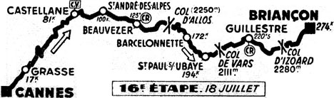 - Dans la descente, dévalant à tombeau ouvert sur une route boueuse, Kubler arrive à Barcelonnette avec une confortable avance qu'il va porter à 4'15" au pied du col de Vars (km 194). Au sommet du col de Vars (km 205), le Suisse est toujours leader avec 3'45" sur Bartali et Robic, 3'47" sur Coppi, 3'55" sur A. Lazaridès, 4' sur Ockers, 5'10" sur Marinelli, 6'05" sur Cogan, 6'30" sur Fachleitner, 6'35" sur Kirchen, 6'50" sur lauredi, 7' sur Dupont etc.
