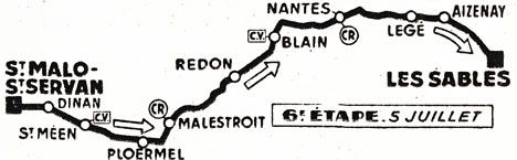 7h15 : St-Malo-St Servan (km 0) - St-Jouan-des-Guérets (km 6) - Châteauneuf d'Ille-et-Vilaine (km 13) - Pleudihen (km 18) - Dinan (km 29) - Saint-Jouan-de-1'Isle (km 53.5) - Saint-Méen (km 63) - Gaël (km 70) - Mauron (km 77) - Ploermel (km 97) - La Chapelle (km 150) - Malestroit (km 113-ravitaillement) - Peillac (km 138) - St-Nicolas-de-Redon (km 149) - La Morissaie (km 153) - Lance (km 185) - Blain (km 180) - Nantes (km 215-ravitaillement) - Les Sorinières (km 222.5) - St-Etienne-de-Corcoué (km 245) - Legé (km 255) - Palluau (km 265) - La Chapelle (km 267.5) - Saint-Mathurin (km 295.5) - Les Sables d'Olonne (km 305).