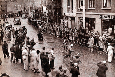 - La côte de Mont provoque alors la sélection finale. Les lâchés sont nombreux, entre autres : Darnauguilhem, Zbinden, Sabatini. Fernandez, Corrieri, Lauk, Brignole et Molines, Renaud, lui, revient sur crevaison, ce qui est un exploit que seul De Mulder réussira... deux fois. C'est alors que les favoris se réveillent et rejoignent rapidement le groupe Rémy. A Verviers (km 207), Robic part résolument et rejoint Géminiani dans la côte à la sortie de la ville. Au sommet, Ockers est à 20", le peloton à 25". La côte de Theux continue la sélection. Au sommet (km 217), Robic a 150 m sur Ockers, 300 sur Géminiani et 1' sur un peloton maigrelet.