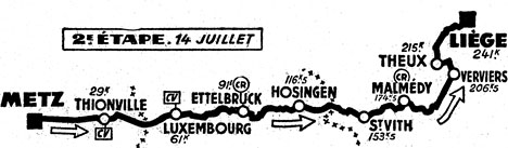 9h00 : Metz (km 0) - Saint-Julien (km 2) - Matroy (km 7) - Ay (km 15) - Bousse (km 19) - Illange (km 25) - Thionville (km 29) - Hettange (km 35) - Roussy-le-Village (km41.5) - Haut-Roentgen - Evrange / frontière (km 48) - (LUXEMBOURG) - Frisange (km 49) - Hesperange (km 56) - Luxembourg (km 61) - Walferdange (km 66.5) - Heisdorf (km 68,5) - Lorentzweiler (km 71.5) - Lintgen (km 74) - Mersch (km 77) - Gruchten (km 84) - Schieren - Ettelbruck (km 91-ravitaillement) - Diekirch (km 96) - Hoscheid (km 108.5) - Hosingen (km 116.5) - Marnach (km 122.5) - Heinerscheid (km 128) - Weiswampach (km 133.5) - (BELGIQUE) - Malscheid (km 138) - Oudler (km 143) - Schirm-Gruttlange (km 146.5) - Saint-Vith (km 153.5) - Ligneuville (km 166) - Malmédy (km 174.5-ravitaillement) - Baraque-Michel (km 189) - Belle-Croix (km 191.5) - Jalhay (km 198.5) - Verviers (km 206.5) - Theux (km 215) - Louveigné (km 222.5) - Beaufays (km 230.5) - Embourg - Liège / circuit (km 241).