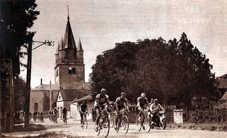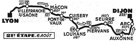 - Robic menaçait de ne pas repartir en raison des 5 minutes de pénalité hier mais ce sont bien 51 rescapés qui ont pris le départ... et respecté la trève dominicale pendant 185 kilomètres (à bonne allure). Aucune offensive, aucun démarrage, rien n'a troublé la longue séance de train soutenu qui permettait à la caravane d'être en avance sur l'horaire prévu. Enfin, à Laperrière (km 183), Baffert attaque brusquement avec Hendrickx dans sa roue. Un peu plus loin, ce seront huit coureurs qui ont faussé compagnie à un peloton qui ne réagit pas : Lambrecht, Hendrickx, Baffert, Giguet, Goldschmit, Bauvin, Rémy & Sciardis. Cogan se lance à leur poursuite et les rejoint à Auxonne au km 194.