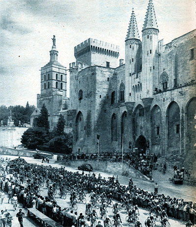 Devant le château des Papes, le peloton démarre d'Avignon. (photo Miroir-Sprint du 27 juillet 1951).