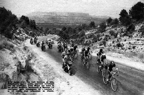 A la sortie d'Aix, huit hommes se sont échappés, ici emmenés par Magni devant Barbotin etc. (photo Miroir-Sprint du 27 juillet 1951).