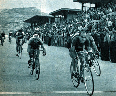 Sur le circuit du Parc Borély à Marseille, l'Italien Fiorenzo Magni s'impose au sprint devant Ockers. (photo But & Club - Miroir des Sports n° 307 du 27 juillet 1951).