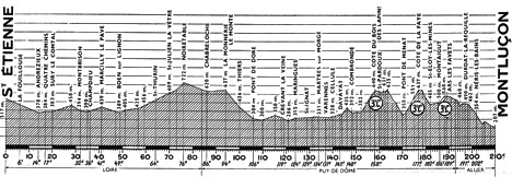 - Après Pont de Dore au km 106, Diot tente sa chance. Il est rejoint par Deledda, Serra, Van Beenen, Van Genechten, Roks & Nolten mais sous l'impulsion de Teisseire, la tentative avorte rapidement. Plusieurs nouveaux démarrages émaillent la progression du peloton : Van Genechten, Bauvin, Darrigade, Colette, Walkowiak, Anzile, Molinéris mais chaque fois Français ou Hollandais ramènent l'ordre et même quelquefois les Italiens. A St-Ignat (km 129) une échappée un peu plus consistante se forme sous l'impulsion de Colette accompagné de Van Geneugden, Teisseire & Van Est. Leur avance ne dépassera pas 20" avant qu'ils ne soient repris. Il faut attendre la difficile fin de parcours pour voir la sélection s'opérer.