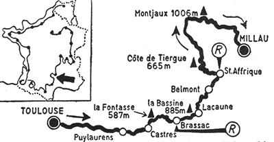 - Dans la côte de Puylaurens (km 48), Forestier se porte en tête et attaque. Il entraîne Varnajo et Lucien Lazaridès alors que Van Genechten & Alomar sont à 20" et le peloton à 35". Le mouvement porte 20 hommes à l'avant parmi lesquels Bauvin, Bobet, Ockers,Wagtmans, Malléjac etc. Au km 57, les "20" comptent 35" d'avance mais à nouveau tout le monde se regroupe. Dès la jonction, Gilles démarre. Schaer et Darrigade le rejoignent mais c'est un nouvel échec au km 64. Gilles ne désarme pas et il redémarre à Castres au km 70. Les positions y sont les suivantes : Gilles en tête, à 45" Forlini, à 1' Lucien Lazaridès, à 1'45" le peloton maillot jaune. Après Castres, Close, Quentin & Croci-Torti partent en poursuite. Devant, L. Lazaridès rejoint Gilles 2 kilomètres avant La Fontasse. Dans ce village, Gilles & L. Lazaridès passent en tête, à 40" Forlini, à 50" Close, à 1'15" Quentin, à 2'25" Croci-Torti, à 2'35" le peloton.