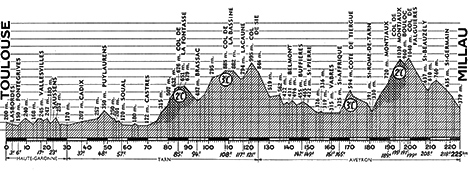 10h00 (Haute-Garonne) : Toulouse/Av. de Castres (km 0) - N621 Lasbordes (km 3) - Fontegrives (km 6) - Vallesvilles (km 17) - Saussens (km 23) - Quatre-Coins (km 27) - (Tarn) : Carr. N621/D42 (km 31) - N621 Cadix (km 37) - Puylaurens (km 48-CV) - Soual (km 57) - N622 Castres (km 70-CV) - La Fontasse (km 78) - Col de La Fontasse (km 85-GPM2) - Brassac (km 94-ravitaillement) - Biot (km 97) - Col de la Bassine (km 108-GPM3) - Lacaune (km 117-CV) - Col de Sié (km 121) - (Aveyron) : D74 Saint-Sever (km 130) - Belmont (km 140-CV) - Buffières (km 146) - Pont Saint-Jean (km 147) - N99 Saint-Pierre (km 149) - Carr. N99/D12 (km 153) - Vabres (km 161) - Saint-Affrique (km 165-ravitaillement) - Côte de Tiergue (km 170-GPM3) - Saint-Rome-de-Tarn (km 180) - Montjaux (km 189) - Col de Montjaux (km 195-GPM2) - Bouloc (km 197) - D30 Saint-Beauzély (km 208) - N111 Saint-Germain (km 218) - Millau/Circ. du Parc de la Victoire (km 225).