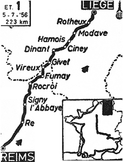 10h30 (Marne) - Reims - N51 Le Linguet (km 0) - Le Poisson-vert - Witry-les-Reims (km 6) - Isles-sur-Suippes (km 14) - (Ardennes) : La Gentillerie - Bergnicourt (près de) (km 23) - Tagnon (km 26) - La Cervelle - Rethel (km 36-CV) - N385 Le Paradis (km 41) - Provizy - Novion-Porcien (km 46) - Wagnon (près de) (km 51) - La Petite Guinguette - Signy-l'Abbaye (km 59) - Lépron-les-Vallées (km 57) - Villaine - Rouvroy-sur-Audry (km 72) - Tremblois-les-Rocrois (km 80) - N51 Cheval-Blanc - Grand-Hongréau - Rocroi (km 89-ravitaillement) - Fumay (km 107) - Fépin (km 113) - Montigny-sur-Meuse - Vireux-Molhain (km 120) - Givet (km 130-CV) - D46 frontière Porte de Namur (km 132) - (BELGIQUE) - Heer-sur-Meuse (km 133) - Blaimont (km 137) - Falmignoul (km 141) - Ansere (km 147) - Dinant (km 150-CV) - Sorinnes (km 155) - Achêne (km 160-CV) - Ciney (km 165-ravitaillement) - Emptinnes (km 169) - Hamois (km 173) - Miécret (km 178) - Havelange (km 181) - Pailhe (km 184) - Modave / Pont de Bonne (km 189) - Strée (km 194) - Villers-le-Temple / 4-Bras (km 199) - Saint-Séverin (km 201) - Ehein (km 203) - Rimière (km 205) - Les Gouhis (km 212) - Angleur (km 220) - Pont-Grosses-Battes (km 221) - Liège / circuit du Quai des Ardennes (km 223).