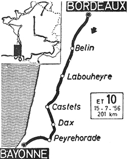 11h10 (Gironde) : Bordeaux - Talence (km 0) - N110 Gradignan (km 3) - La House (km 6) - Bellevue - Jauge (km 13) - Le Puch - Le Barp (km 25) - La Vignolle (km 29) - Béliet (km 36) - Belin (km 38-CV) - Carr. N10-GC3 (près de Mons) (km 41) - (Landes) : Le Muret (km 48) - Hourson-Crabot - Liposthey (km 59) - Labouheyre (km 71-ravitaillement) - Cap-du-Pin (km 79) - Laharie (km 91) - Le Bouscat - Le Souquet (km 101) - Carr. N10-VO (km 105) - Castets-des-Landes (km 113) - N647 Carr. VO (km 123) - Saint-Paul-les-Dax (km 133) - Dax (km 135-ravitaillement) - Carr. N647-D129 (km 136) - D129 Carr. D29 (km 138) - D29 Carr. D22 (km 145) - Haubardin - Cagnotte (près de) (km 151) - Peyrerohade (km 159-CV) - (Basses-Pyrénées) : D19 Carr. N636 (km 168) - N636 Bidache - Bardos (km 173) - N636 Carr. D10 (km 178) - N636 Carr. D23 (km 181) - Briscous - N636 Carr. D21 (km 186) - Salines-de-Briscous - N636 Carr. D257 (près de Mouguerre) (km 192) - Saint-Pierre-d'Irube - Bayonne / Vélodrome (km 201).