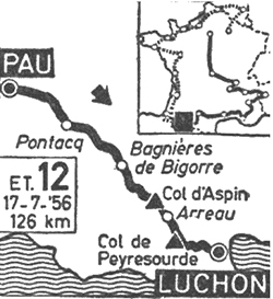 13h05 (Basses-Pyrénées) : Pau (km 0) - N117 Idron (km 3) - Ousse (km 5) - Soumoulou (km 13) - N117 Carr. N640 - N640 Espoey (km 16) - Livron - Barzun (km 20) - Pontacq (km 24-CV) - Barbe - Bendelles (km 29) - (Hautes-Pyrénées) : Ossun (km 32) - D6 Carr. N21 (km 35) - Lanne - D16 Carr. D7 (km 37) - D7 Benac (km 38) - Orincles (km 41) - D7 Carr. D407 (km 41) - D407 Carr. N637 (km 43) - N637 Loucrup (km 45) - N367 Carr.N135 (km 48) - N135 Trébons (km 50) - Pouzac (km 53) - Bagnères-de-Bigorre (km 55-CV) - Beaudéan (km 60) - Campan (km 61) - Saint-Roch - Galade - Arrimoula - Sainte-Marie-de-Campan (km 67) - N618 La Séoube - Espladet / Carrière de marbre (km 75) - Col d'Aspin (km 80-GPM2) - Arreau (km 93-ravitaillement) - Bordères-Louron (km 98) - N618 Carr. D25 (km 101) - Anéran-Camors (km 103) - Estarvielle (km 104) - Col de Peyresourde (km 111-GPM1) - Garin (km 117) - Cazaux (km 119) - N618 Carr. D51 (km 121) - Bagnères-de-Luchon / Allées d'Étigny (km 126).
