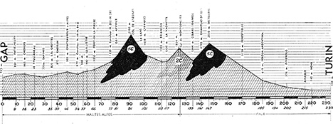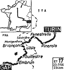 09h45 (Hautes-Alpes) : Cap (km 0) - N94 La Batie-Neuve (km 9) - Chorges (km 16) - N940 Le Thubaneau (km 23) - N94 Savines (km 29) - Embrun (km 39-CV) - Châteauroux-les-Alpes (km 46) - N94 Carr. N94d / côte 877 (km 53) - N94 Carr. N94d (km 57) - N202a Guillestre (km 60) - N202 Maison-du-Roy - Pont-de-le-Pierre (km 65) - N202 Carr. N547 (km 77) - Arvieux (km 81) - Col de l'Izoard (km 91-GPM1) - Cervières (km 101) - Briançon (km 113-ravitaillement) - N94 la Vachette (km 116) - Col de Montgenèvre (km 125-GPM2) - (ITALIE) - N24 Clavières - Cesana Torinese (km 134) - Champlas-du-Col (km 141) - Sestrières (km 146-GPM1) - Traverses - Pragelato - Fourrières - Fenestrelle (km 170-ravitaillement) - Mentoulles (près de) - Villaretto - Rareto - Perosa-Argentina (km 185) - Rivoira - S. Germano (Carr. près de) (km 194) - Biaglietto - Pinerolo (km 202-CV) - Airasca (km 215) - None (km 219) - Turin (Torino) / Stadio communale (km 234).