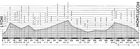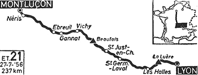 9h48 (Rhône) : Lyon / Tas. la Demi-Lune (km 0) - Craponne (km 5-CV) - D24 Crézieu-la-Varenne - D24 Carr. D70 (km 9) - Col de la Luère (km 13-GPM3) - La Brevenne (km 21) - N496 La Giraudière (km 25) - N496 Carr. D101 (km 28) - Ste-Foy-l'Argentière (km 33) - N89 Les Halles (km 38-CV) - Le Poteau - (Loire) : Saint-Martin-Lestra (km 45) - N98 Carr. D60 (km 53) - Feurs (km 56) - N98 Carr. D60 (km 59) - Carr. D18 (km 61) - D18 Ste-Foy-St-Sulpice (km 66) - D18 Carr. D8 (km 74) - D8 Saint-Germain-Laval (km 77-ravitaillement) - D1 Grézolles (km 84) - N81 St-Just-en-Chevalet (km 95-CV) - N495 La Tuillière (km 99) - Saint-Priest-La Prugne (km 107) - (Allier) : Col du Beau Louis (km 114-GPM3) - Ferrières-sur-Sichon (km 122) - IC78 Carr. (km 123) - Arronnes (km 130) - La Gué-Chervais (km 134) - Cusset (km 144) - GC 27 Vichy / Pt. Boutiron (km 149) - GC27 carr. GC6 (km 150) - GC6 Carr. N9a (km 154) - Cognat (km 162) - Gannat (km 171-ravitaillement) - N698 Ébreuil (km 185-CV) - Lalizolle (km 191) - La Bosse (km 195) - Échassière (km 198) - (Puy-de-Dôme) : Lapeyrousse (km 206) - IC13 Carr. N143 (km 213) - N143 Ars-les-Favets (km 217) - (Allier) : Larequille (km 224) - Néris-les-Bains (km 229-CV) - Montluçon / Quai Rouget de L'Isle (km 237).