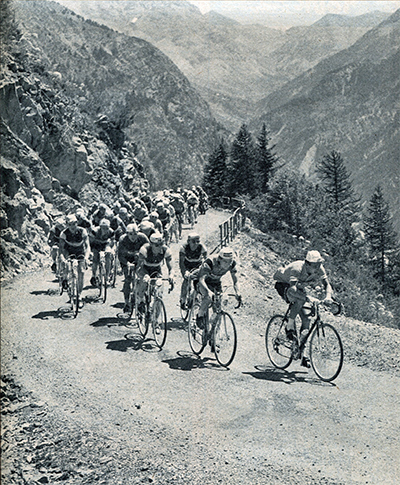 Dans le col d'Allos, Anquetil emmène tranquillement le peloton.