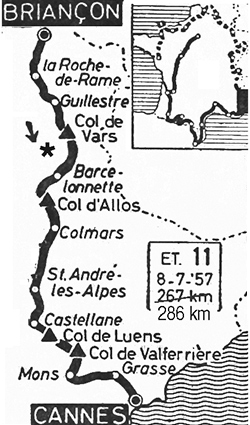 8h30 (Hautes-Alpes) : N94 Briançon (km 0) - N94 Chamandrin (km 1) - Prelles (km 5.5) - Saint-Martin de Queyrières (km 6.5) - L'Argentière-La Bessée-du-Milieu (km 13) - La Bessée-Basse (km 14) - La-Roche-de-Rame (km 19.5) - Saint-Crépin (km 25) - Montdauphin-Gare (km 29.5) - N202a Guillestre (km 33-CV) - N202 Vars-St-Marcellin (km 42.5) - Col de Vars (km 52-GPM1) - (Basses-Alpes) : Mélezen (km 56) - Saint-Paul-sur-Ubaye (km 60) - N202 Carr. N100 (km 67) - N100 La Condamine-Châtelard (km 69) - Jausiers (km 74) - Barcelonnette (km 101) - N202 Carr. N208 (km 102.5) - N208 Col d'Allos (km 121-GPM1) - La Foux (km 129.5) - Allos (km 137) - Colmars (km 145) - Beauvezer (km 150) - N208 Carr. D2 (km 155) - N208 Carr. N555 (km 157) - Thorame-Haute (km 161) - La Mûre (km 170.5) - N507 Saint-André-les-Alpes (km 173-CV) - Saint-Julien (près de) (km 177) - N555 Carr. N207 (km 181) - Le Cheiron (km 189) - Castellane (km 192-CV) - N85 La Garde (près de) (km 198) - Col de Luens (km 201-GPM3) - (Alpes-Maritimes) : Le Logis-du-Pin (km 211) - Séramon (près de) (km 216) - Col de Valferrière (km 221) - (Var) : N563 Mons (km 233.5-ravitaillement) - D56 Carr. D656 (km 238) - N656 Carr. N105 (km 243.5) - (Alpes-Maritimes) : D105 Saint-Cézaire (km 249-GPM3) - D13 Le Tignet (km 254.5) - D513 Spéracèdes (km 256.5) - D11 Cabris (km 259.5-CV) - D4 Grasse (km 265.5-CV) - N567 Mouans-Sartoux (km 272.5) - D409 La Roquette (km 275.5) - La Bocca (km 284.5) - M7 Cannes / Les Allées de la Liberté (km 286).