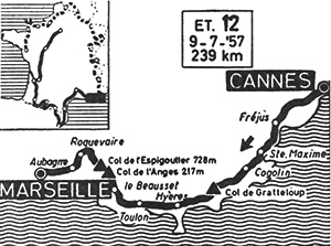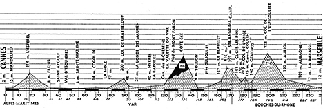 9h45 (Alpes-Maritimes) : Cannes (km 0) - N7 La Bocca (km 2.5) - Mandelieu/Les Thermes (km 5.5) - Tremblant (Carr. près de) (km 10.5) - (Var) : L'Esterel : Auberge des Adrets (km 18) - Carr. du Logis de Paris (km 20) - Fréjus (km 34) - N98 Saint-Aygulf (km 41) - Les Issambres - Val d'Esquières (km 47) - Sainte-Maxime (km 55) - Beauvallon (km 61-souv. H.D) - N98 Carr. N98a (km 64) - Cogolin (km 68) - Col de Gratteloup (km 89.5) - N98 Carr. N559 (km 93) - La-Lande-des-Maures (km 100.5) - Mauvanne (km 104) - Carr. Beauchamps (km 106.5) - Hyères (km 110-ravitaillement) - Carr. des 4-chemins (km 119.5) - N98 Carr. N97 (km 121.5) - D246 La Valette-du-Var (km 123.5-CV) - Fort-Faron (km 128) - Mont-Faron (km 134-GPM1) - Toulon (km 145-CV) - N8 Ollioules (près de) (km 153) - Sainte-Anne (km 158) - N8 Le Beausset/Carr. D26 (km 161) - Sainte-Anne-du-Camp (km 170.5) - (Bouches-du-Rhône) : N8 Cuges-les-Pins (km 177) - Col de l'Ange (km 180.5) - Carr. Coulin (km 183.5) - N96 Gémenos (km 186-ravitaillement) - D2 Col de l'Espigoulier (km 198-GPM2) - D2 Carr. D45a (km 201.5) - D45a Les Bosqs (km 207.5) - Carr. Le Pignol (km 210.5) - N560 Auriol (km 212.5) - Roquevaire (km 217) - Napolon (km 221.5) - Aubagne (km 224.5-CV) - La Penne-sur-Huveaune (km 229.5) - Saint-Marcel (km 233.5) - Saint-Loup (km 236.5) - Marseille / Vélodrome (km 239).