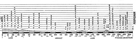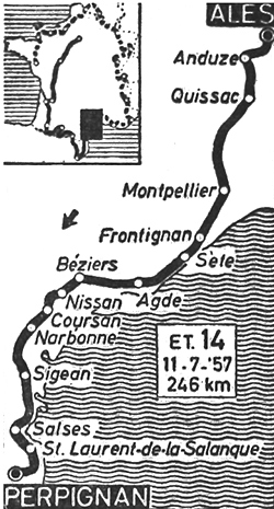10h00 (Gard) : Alès / Av. d'Anduze (km 0) - N110 Saint-Christol (km 3) - N110a Bagard (km 6) - Anduze (km 11.5-CV) - N582 La Madeleine (km 15.5) - D35 Saint-Roman (km 19) - Villeseque (km 23) - D35 Carr. D8 (km 25.5) - Quissac (km 30.5) - D45 Corconne (km 37) - (Hérault) : D17 Sauteyrargues (Carr. près de) (km 41.5) - Valflaunes (près de) (km 47.5) - D17 Carr. D1 (km 50.5) - Prades-le-Lez (km 60) - Montferrier (près de) (km 63.5) - Montpellier (km 70.5-CV) - N113 Carr. N108 (km 74) - N108 Mireval (km 84.5) - Frontignan (km 92.5) - Lapeyrade (km 95.5) - Sète (km 100-ravitaillement) - Marseillan - Agde (km 123-CV) - N112 Vias (km 127) - Villeneuve (Carr. près de) (km 139) - Béziers (km 145) - N9 Nissan-lez-Enserune (km 156) - (Aude) : Coursan (km 165) - Narbonne (km 172-ravitaillement) - Prats-de-Cest (km 180.5) - Peyriac-de-Mer (près de) (km 184) - Sigean (km 193) - Les-Cabanes-de-la-Palme (km 201) - Les-Cabanes-de-Fitou (km 208) - (tPyrénées-Orientales) : Salses-le-Château (km 218) - D11 Saint-Hypolyte (km 224.5) - Saint-Laurent-de-la-Salanque (km 227) - Torreilles (km 229) - Canet-en-Roussillon (km 236) - N167 Perpignan / Bd. Wilson (km 246).