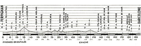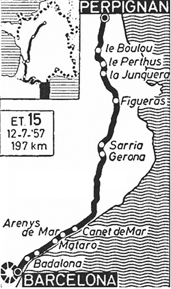 vendredi 12 juillet 12h30 (Pyrénées-Orientales) : Perpignan / Rte d'Espagne (km 0) - N9 Pollestres (près de) (km 6) - N9 Mas Sabola / Carr. N612 (km 10) - Rameylbe (km 12) - Le Boulou (km 20) - N9 Carr. N618 (km 23) - La Cluse (km 25) - Le Perthus (km 30-CV) - (ESPAGNE) - N11 El Jonquera (km 36) - Pont de Molins (km 49) - Hostalets de Liers (km 51) - Figueras (km 56-CV) - Bascara (km 69) - Medina (km 83) - Sarria de Ter (km 88) - Gerona (km 91-ravitaillement) - Palau (km 94) - Santa Susanna (km 137) - Pineda (km 139) - Calella (km 141) - San Pol de Mar (km 145) - Canet de Mar (km 149) - Arernys de Mar (km 142) - Caldetas (km 155) - Mataro (km 163-CV) - San Juan de Vilasar (km 168) - Premia de Mar (km 171) - Masnou (km 175) - Mongat (km 179) - Badalona (km 182-CV) - San Adrian (km 185) - Barcelone / Stade de Montjuich (km 197).