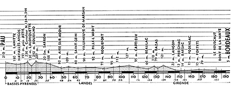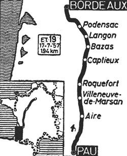 11h30 (Basses-Pyrénées) : Pau / Av. Jean Mermoz (km 0) - N134 Lahitte (km 9) - Navailles-Angos (km 13) - Astis (près de) (km 16) - N134 Carr. N344 (km 19) - Lalonquette (près de) (km 22) - Boueilho (km 26) - (Landes) : Sarron (km 35) - Saint-Agnet (km 36) - Aire-sur-Adour (km 48-CV) - Saint-Gein (km 62) - Villeneuve-de-Marsan (km 69) - Pille-l'Ardit (km 77) - Roquefort (km 85-CV) - N132 Camp du Poteau (km 103) - (Gironde) : Captieux (km 114) - Beaulac (km 123) - Bazas (km 131-ravitaillement) - Langon (km 146-CV) - N113 Preignac (km 151) - Barsac (km 154) - Cerons (km 157) - Podensac (km 160-CV) - Virelade (km 162) - Arbanats (km 164) - Portets (km 167) - Castres-Gironde (km 169) - Beautiran (km 170) - Le Bouscaut (km 182) - Villenave d'Ornaon / Pont de la Maye (km 186) - Bordeaux / Vélodrome Lescure (km 194).