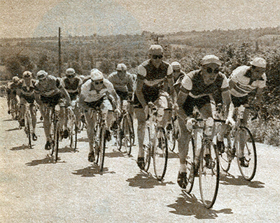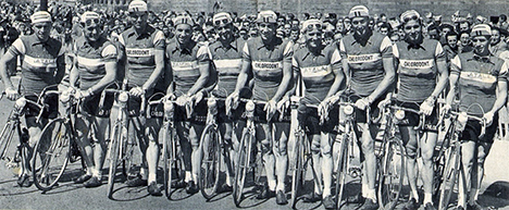 L'Équipe d'Italie au départ de ce 44ème Tour de France 1957. Ils peuvent compter sur Nencini (6ème à.p. de la gauche), vainqueur du Giro ou Astrua (1er à.p. de la gauche).