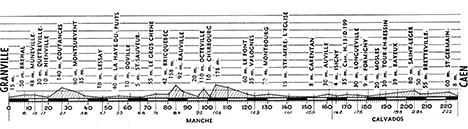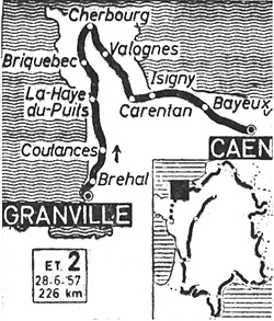 10h40 (Manche) : Granville / Av. de la Libération (km 0) - N171 Donville-les-Bains (km 1) - Coudeville (km 5.5) - Muneville-sur-Mer (km 13) - Quetreville-sur-Sienne (km 17) - Hyenville (km 20) - Coutances (km 27-CV) - D2 La Vendelée (km 31) - Montsurvent (km 35.5) - N800 Lessay (km 47.5) - N800 Carr. D306 (km 51.5) - La Haye-du-Puits (km 55.5-CV) - La Sangsurière (km 62) - Saint-Sauveur-le-Vicomte (km 66.5) - N800 Carr. D42 (km 72) - Le-Gros-Chêne (km 74.5) - Bricquebec (km 80.5-CV) - Quettetot (km 84) - Breuville (km 90) - N800 Carr. D3 le Pont (km 98) - D3 Octeville (km 100) - Cherbourg (km 103.5-ravitaillement) - N13 La-Mare-à-Canards (km 106.5) - Langevin-Delasse (km 113) - Saiont-Joseph (km 118) - Le-Pont-à-la-Vieille (km 120) - Valognes (km 123.5-CV) - Montebourg (km 103.5) - Emedonville (près de) (km 134) - Neuville-au-Plein (km 138.5) - Sainte-Mère-Église (km 140.5) - Blosville (km 145) - Carentan (km 153.5) - N13 Carr. N174 La Fourchette (km 157.5) - Gatz (km 158.5) - Auville-sur-le-Vey (km 161) - (Calvados) : Isigny (km 164.5-CV) - Osmanville (km 166.5) - N13 Carr. D199 (km 170) - La Cambe (km 172.5) - Longueville (km 176.5) - Normanville (km 179.5) - Formigny (km 180.5) - Mosles (km 186.5) - Tour-en-Bessin (km 189.5) - Vaucelles (km 193.5) - Bayeux (km 195.5-CV) - N13 Carr. D35 Vieux-Pont (km 202) - Saint-Léger (km 204) - Ste-Croix-Gand-Tonne (près de) (km 207) - Breteville-l'Orgueilleuse (km 211) - Le Bourg (km 214) - Caen / Circuit de la Prairie (km 226).